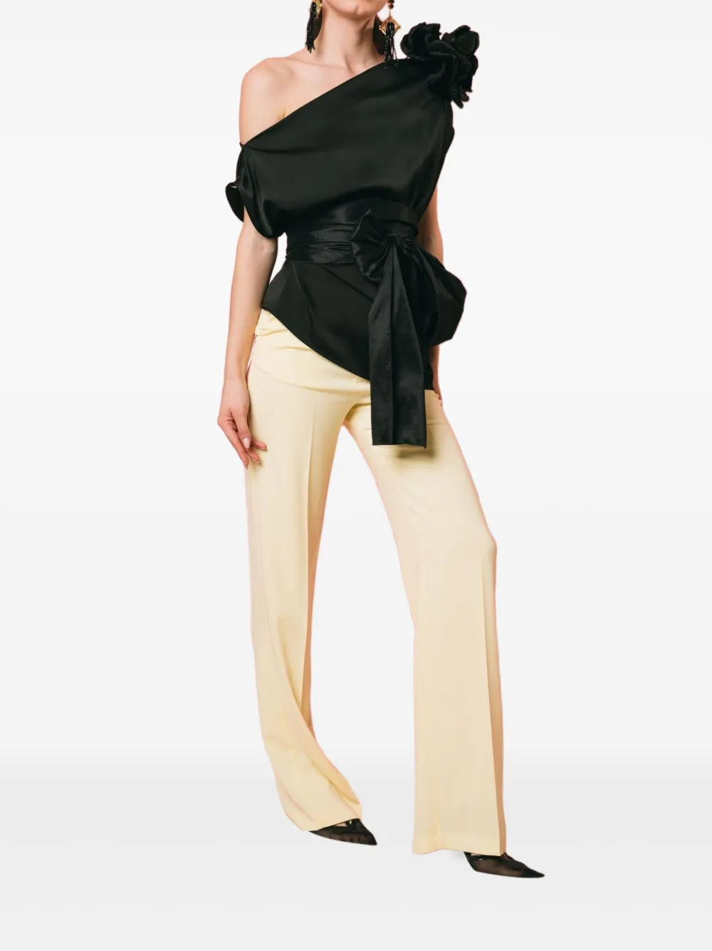 чёрное платье на одно плечо с цветочным декором, завязками и короткими рукавами
