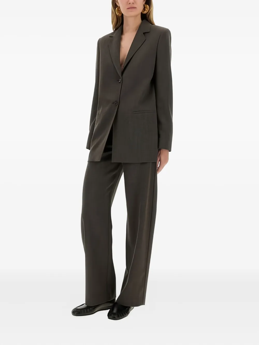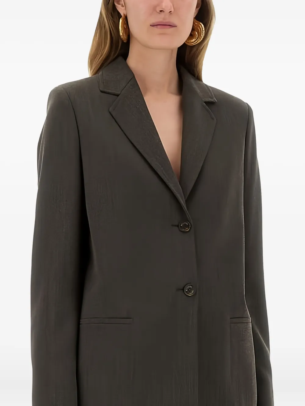 серые заострённые лацканы, застёжка на пуговицы спереди, передние прорезные карманы, длинные рукава, манжеты на пуговицах
