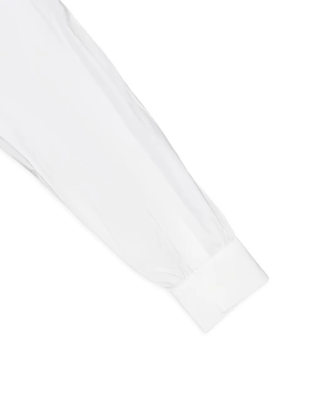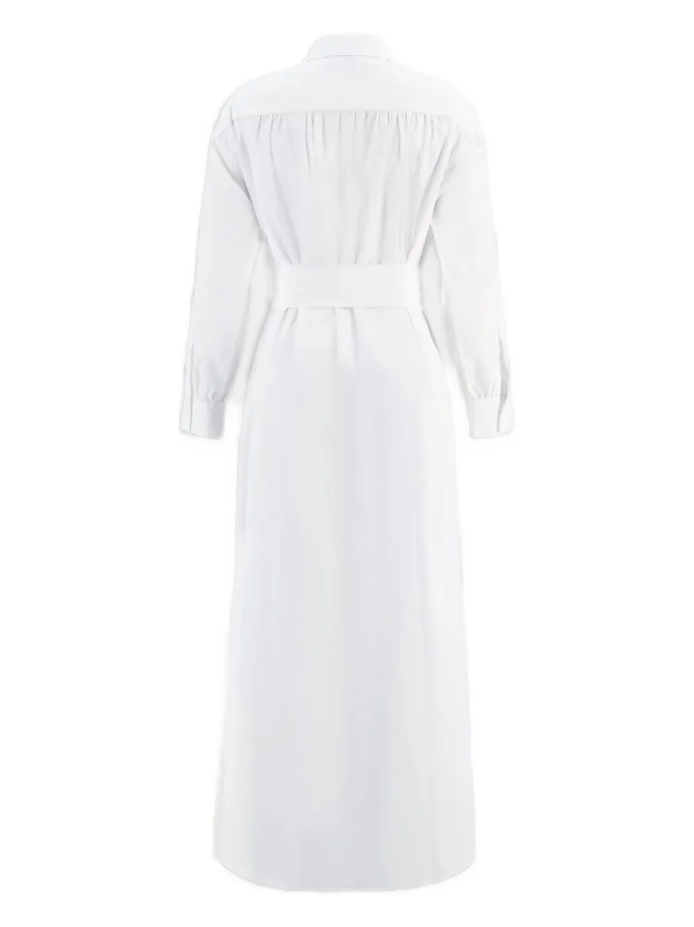 белое платье средней длины с прямым воротником, длинными рукавами, манжетами на пуговицах и поясом на талии