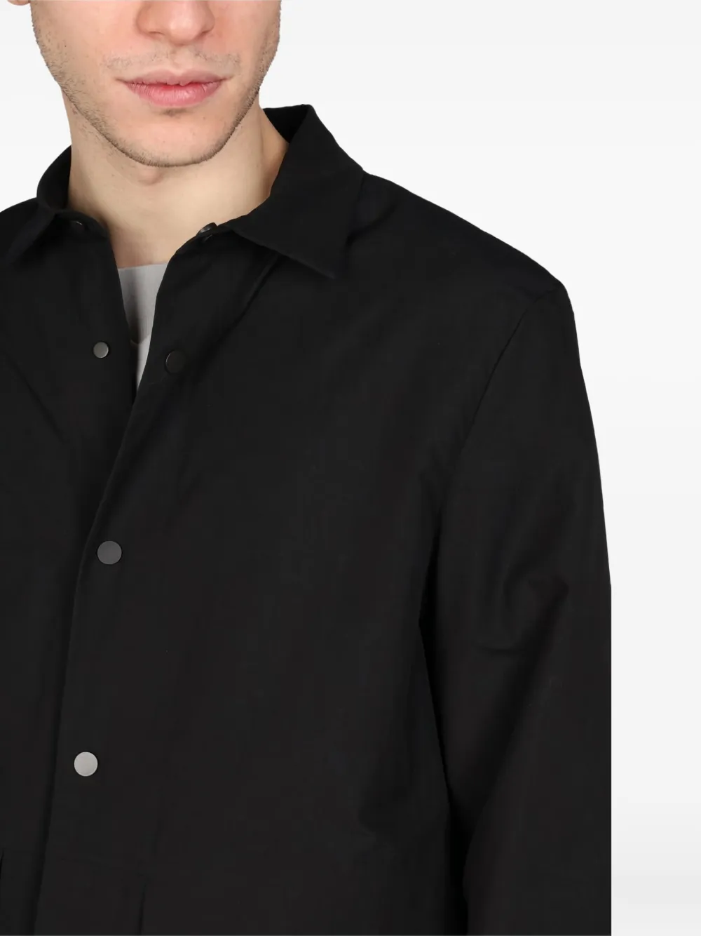 чёрная куртка с застёжкой на кнопки, отложным воротником, нагрудными накладными карманами, длинными рукавами и прямым подолом