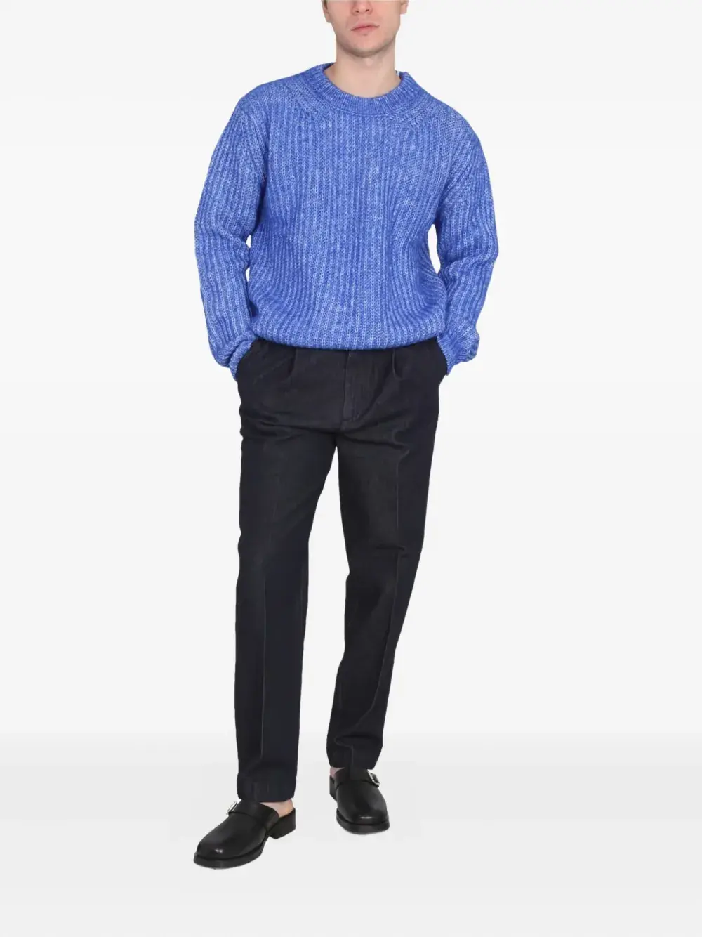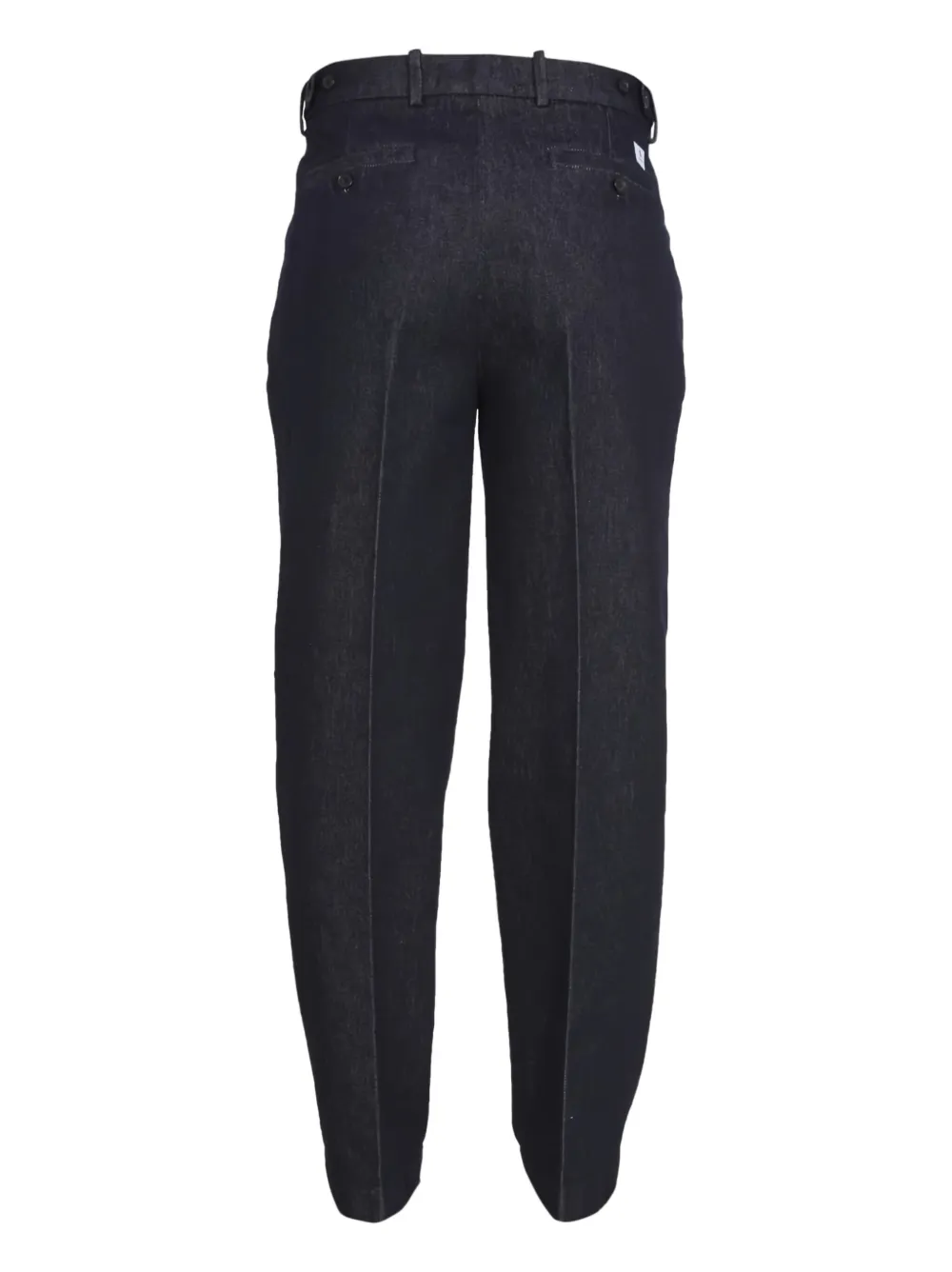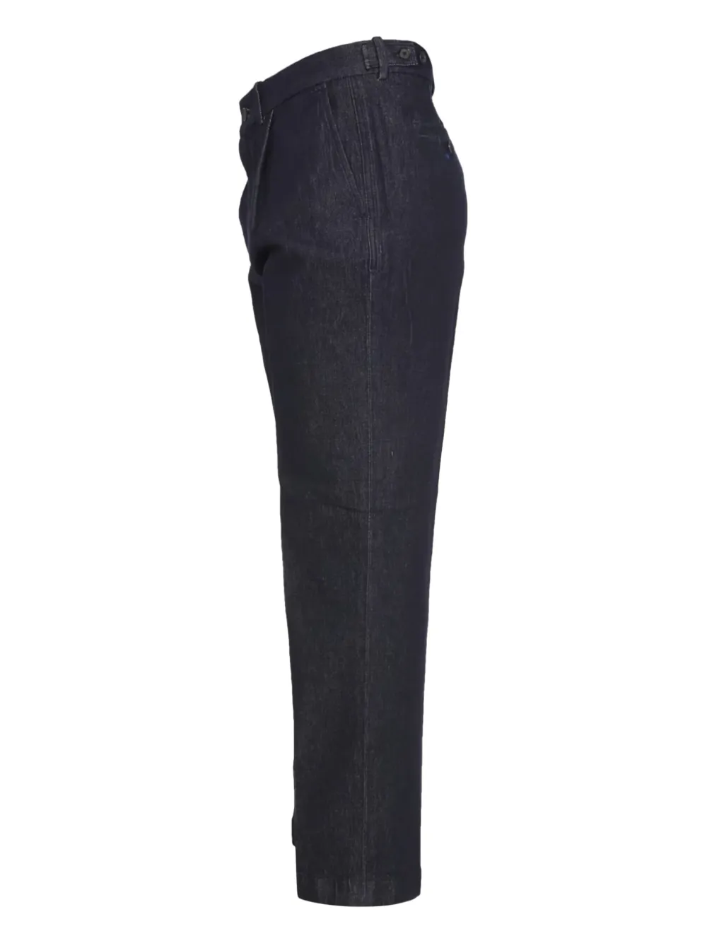 синие брюки с застежкой на пуговицы, шлевками для ремня и складками
