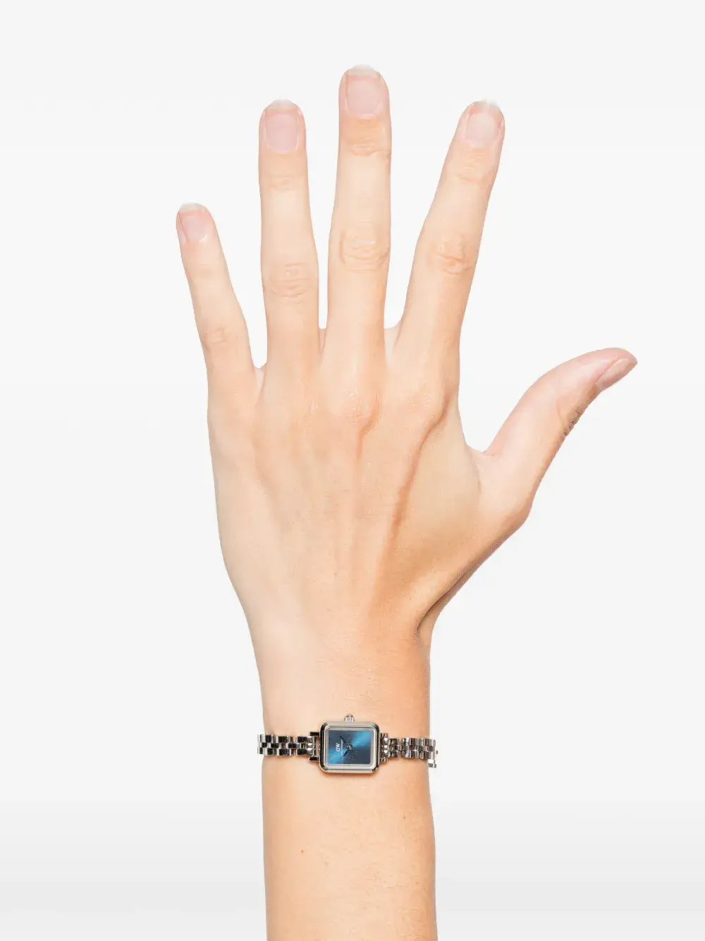синий циферблат, квадратный корпус, размер корпуса 18,2 мм, браслет с тремя звеньями, кварцевый механизм, заводная головка, водонепроницаемость до 3 ATM