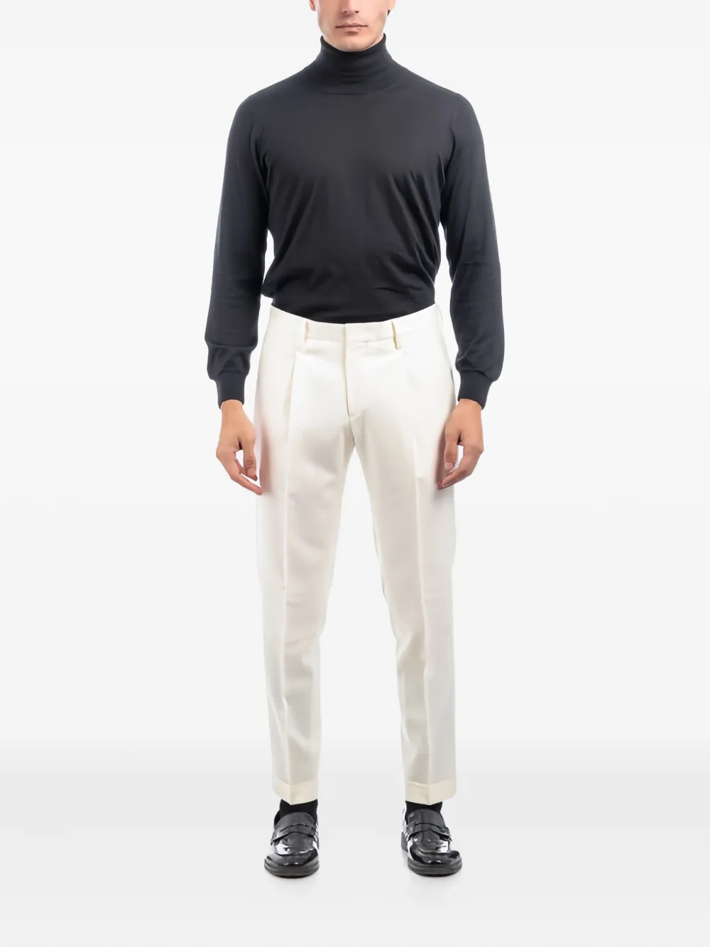 белый с петлями для ремня, боковыми карманами и передними складками
