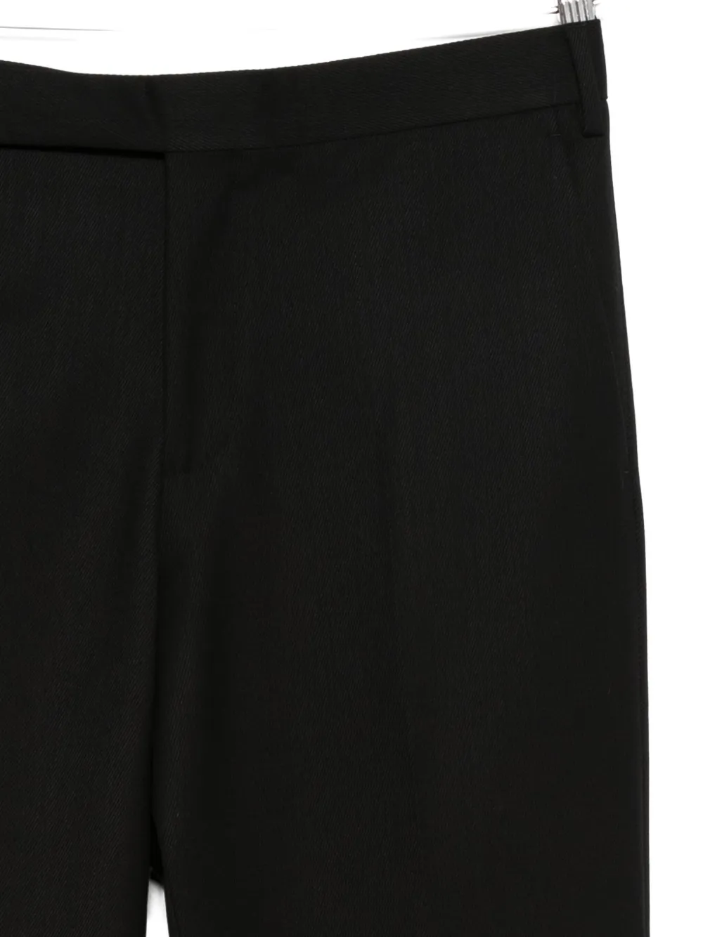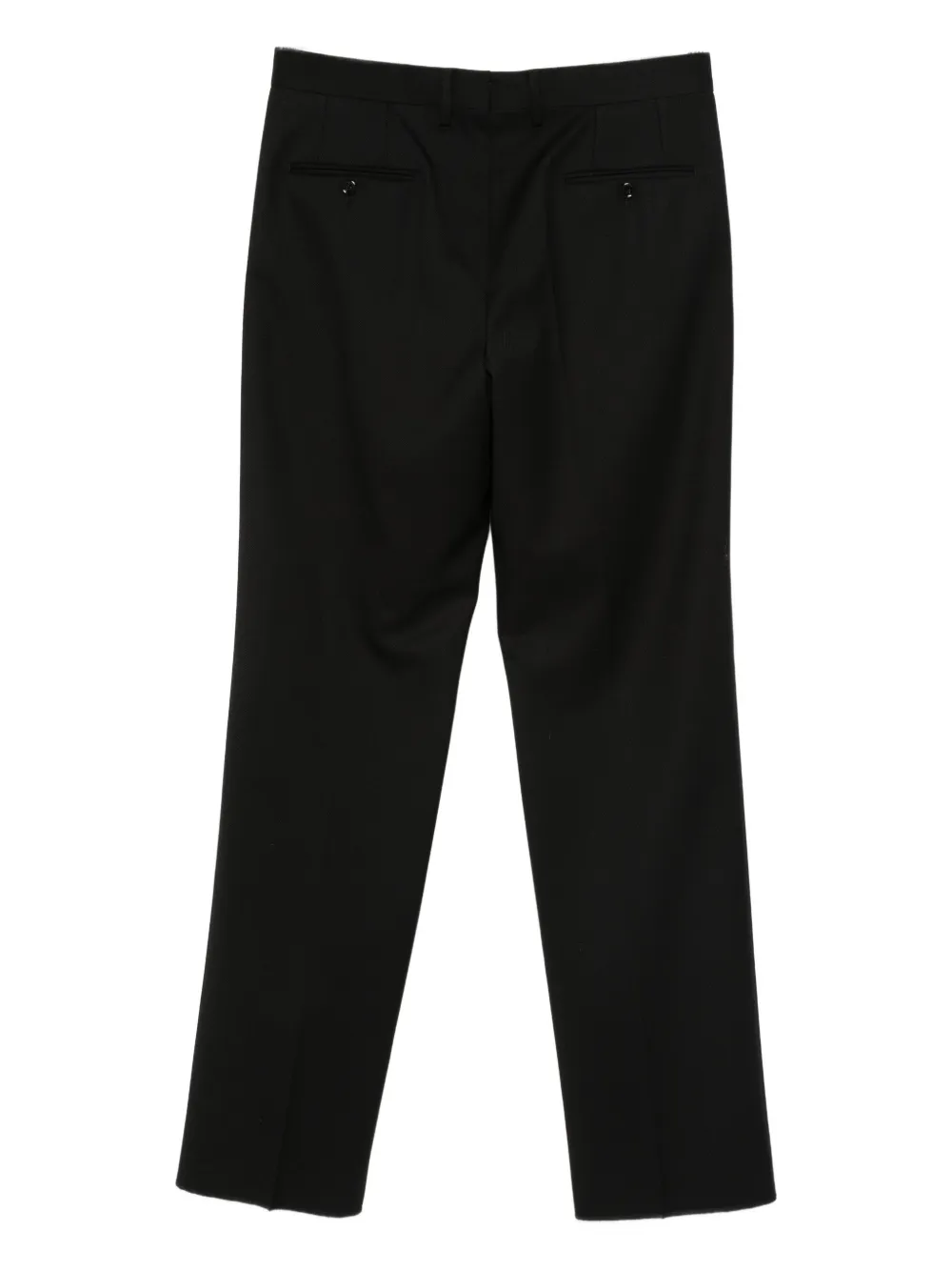 чёрные брюки с потайной застёжкой, шлёвками для ремня, боковыми прорезными карманами, задними прорезными карманами и выразительной стрелкой