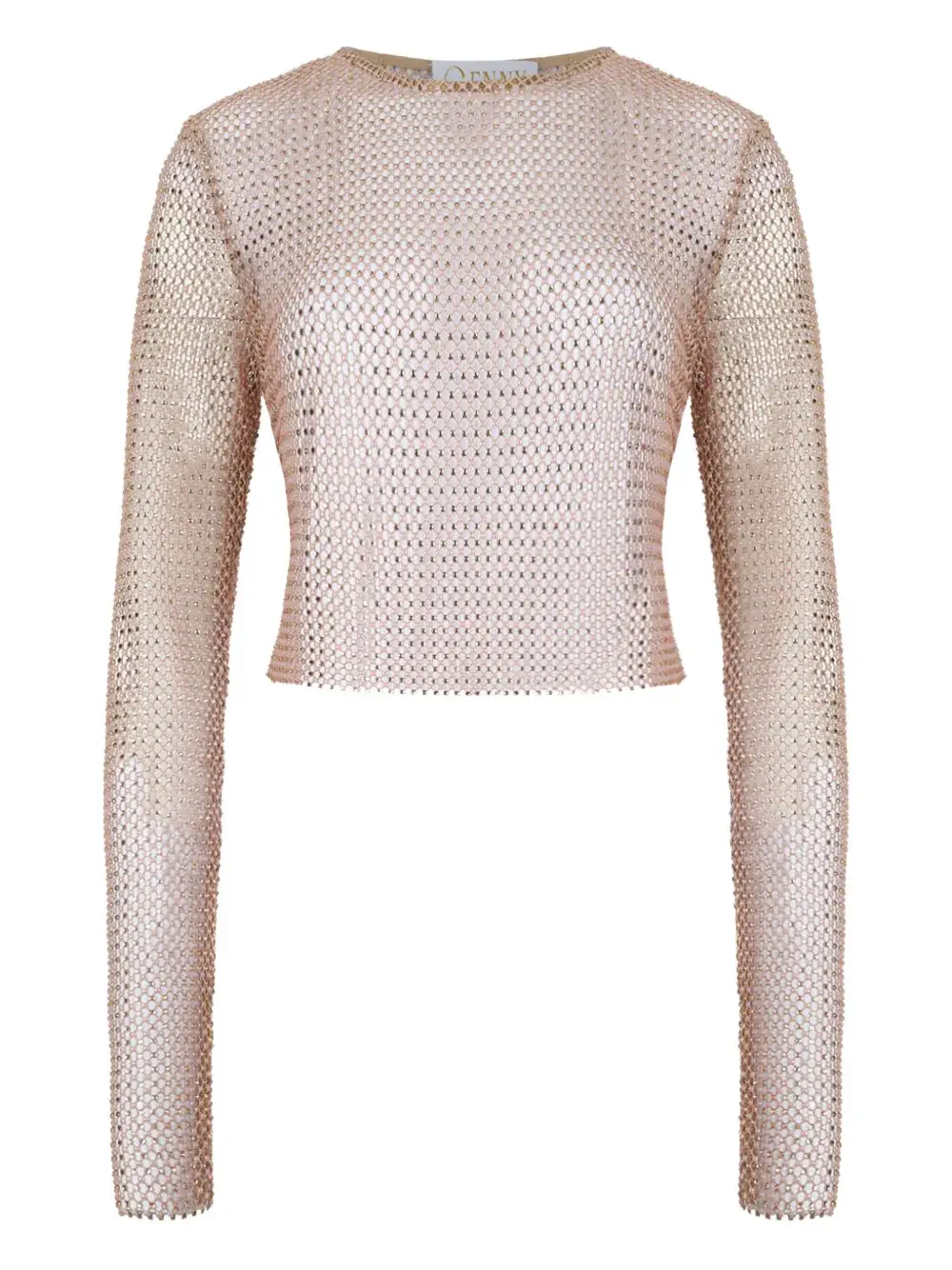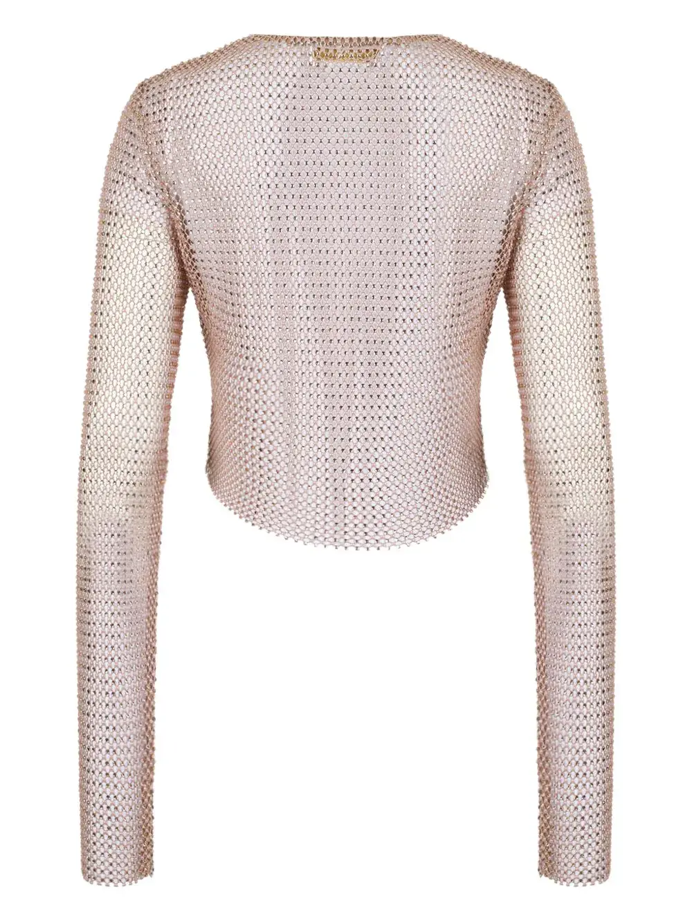 светло-розовый топ из сетки с декорированными вставками, круглым вырезом, длинными рукавами и фигурным краем
