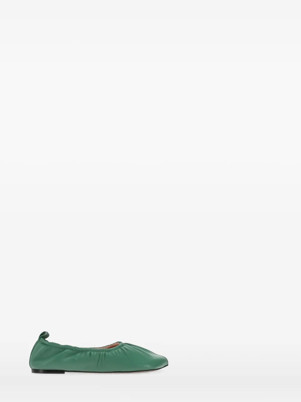 зеленая телячья кожа, сборка, плоская подошва, заострённый носок, петля для надевания