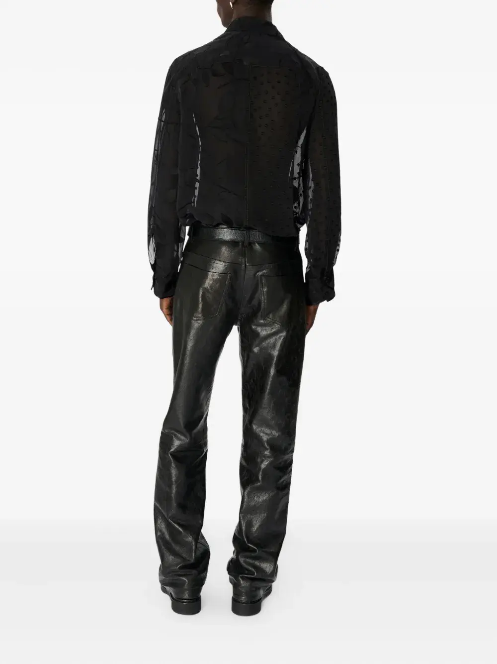 черный кожаный ремень с тиснением в виде полумесяца, шлевки для пояса, застежка на пуговицы, накладные карманы, глянцевая отделка