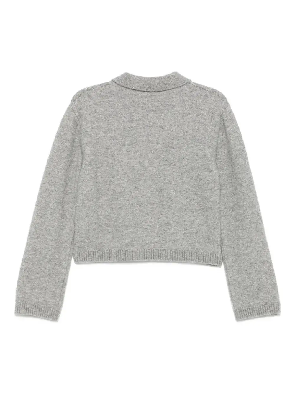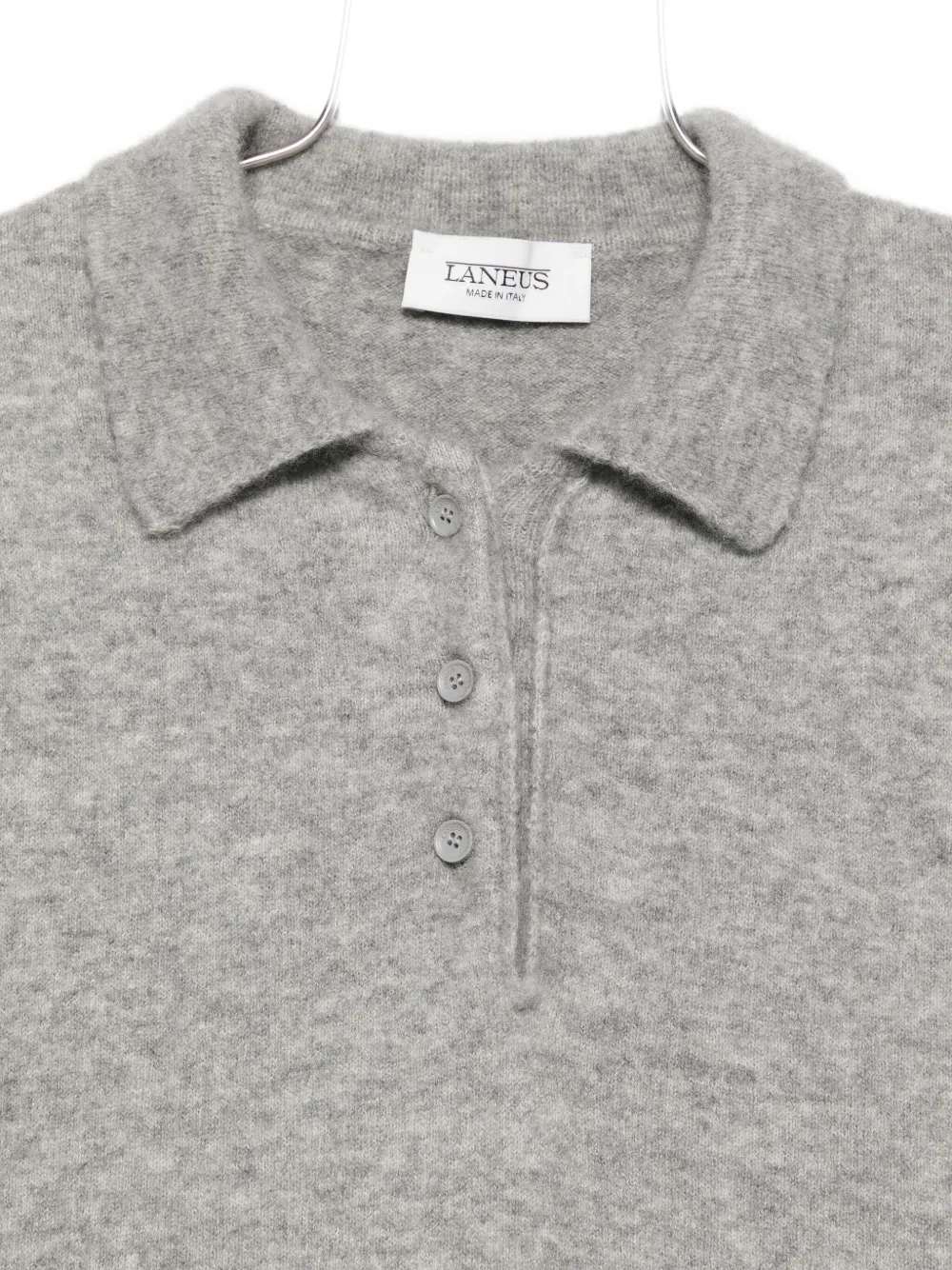 серое поло с воротником, застежкой на пуговицы спереди, длинными рукавами, ребристым низом и манжетами