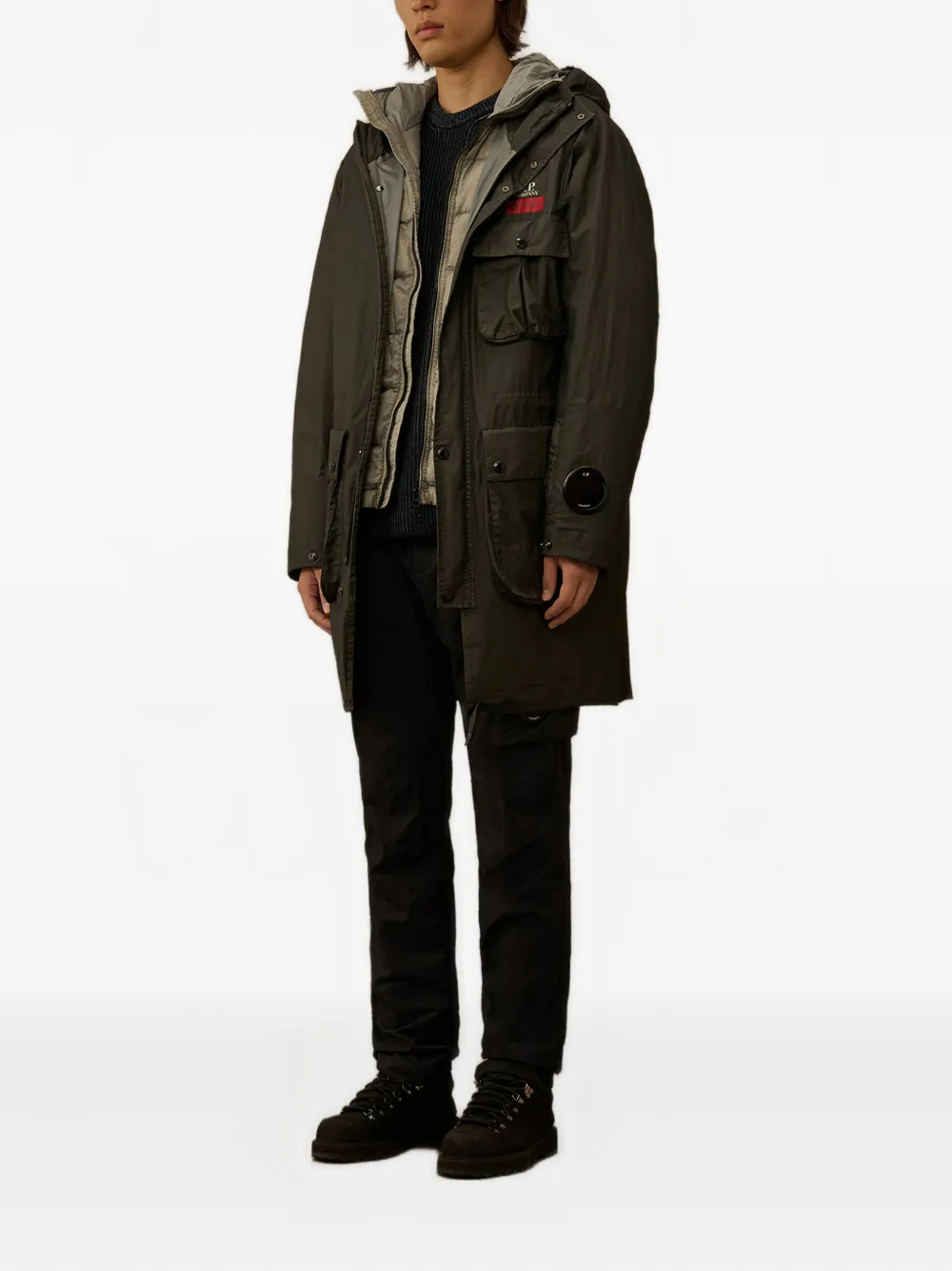 темно-зеленый худи с деталями-«гогглы» на капюшоне, застежка на пуговицах, множественные карманы, нашивка с логотипом