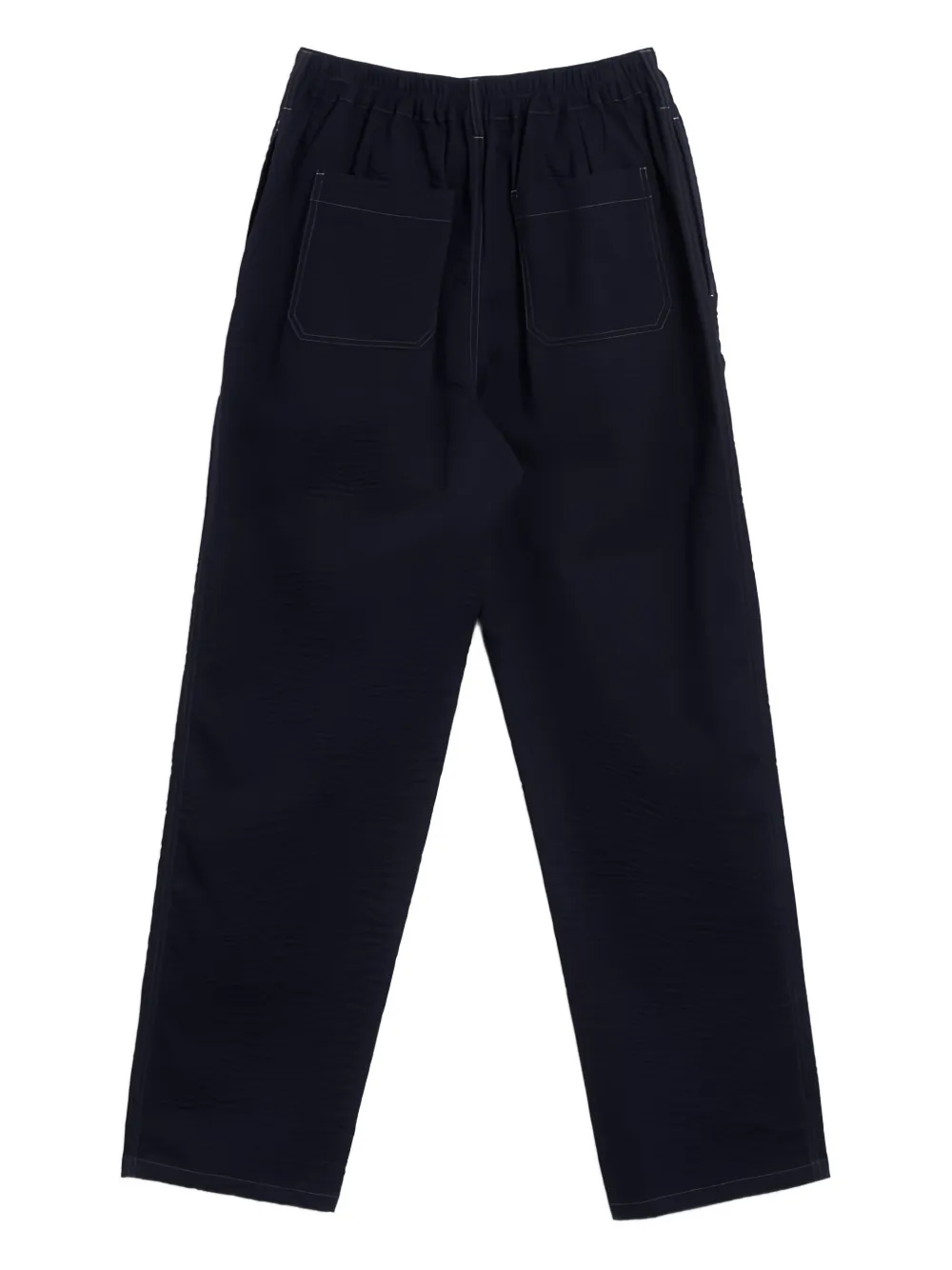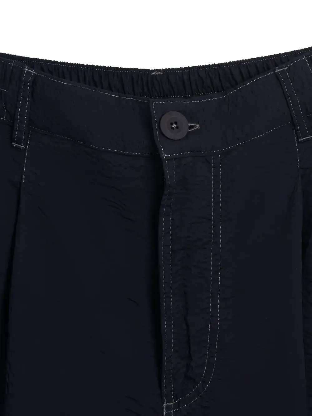синий эластичный хлопок, застежка на пуговицы, эластичный пояс, накладные карманы сзади, тональная строчка