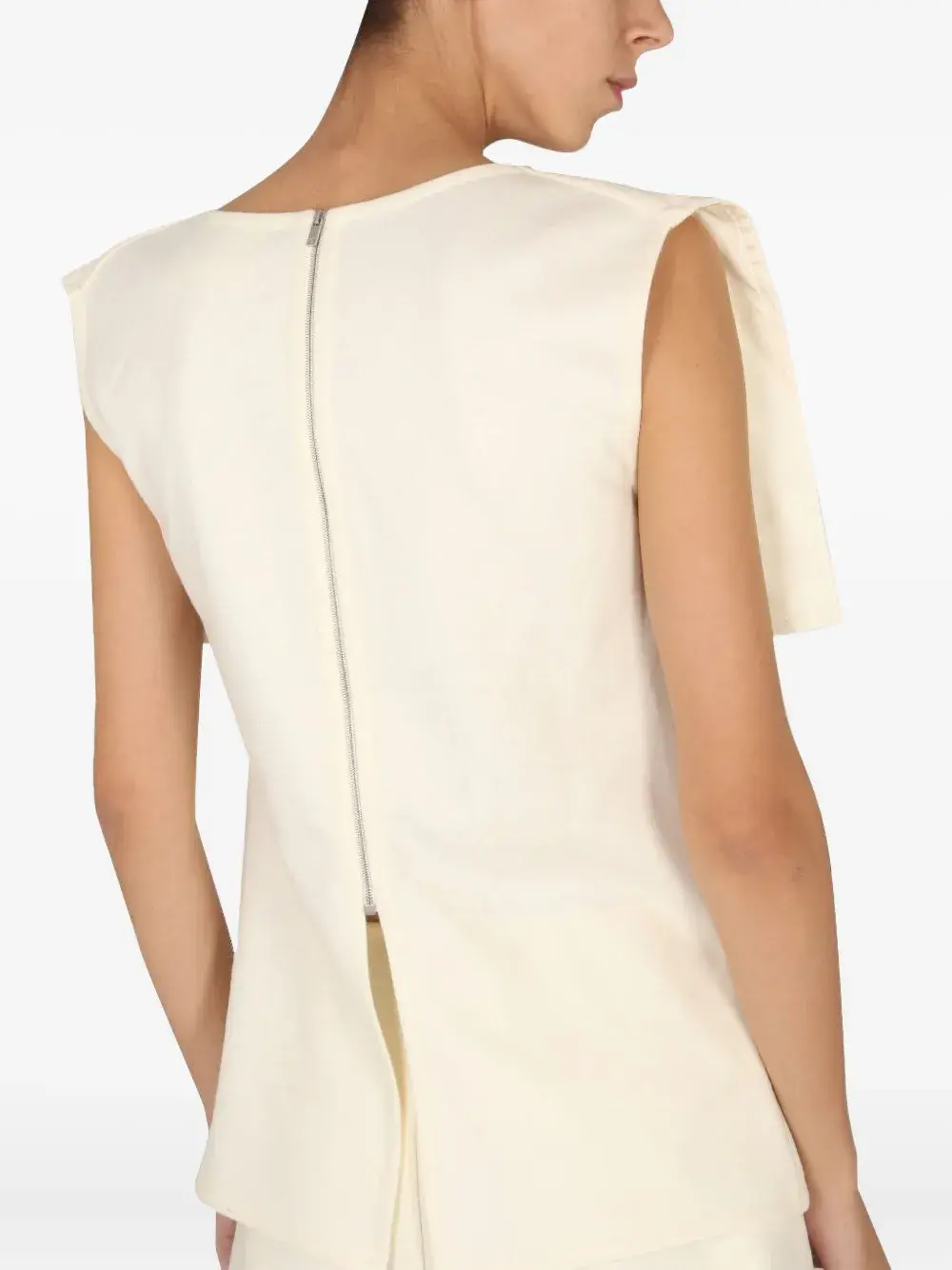 белый топ без рукавов с воротником-стойкой, драпировкой, застежкой-молнией сзади и разрезом на спинке