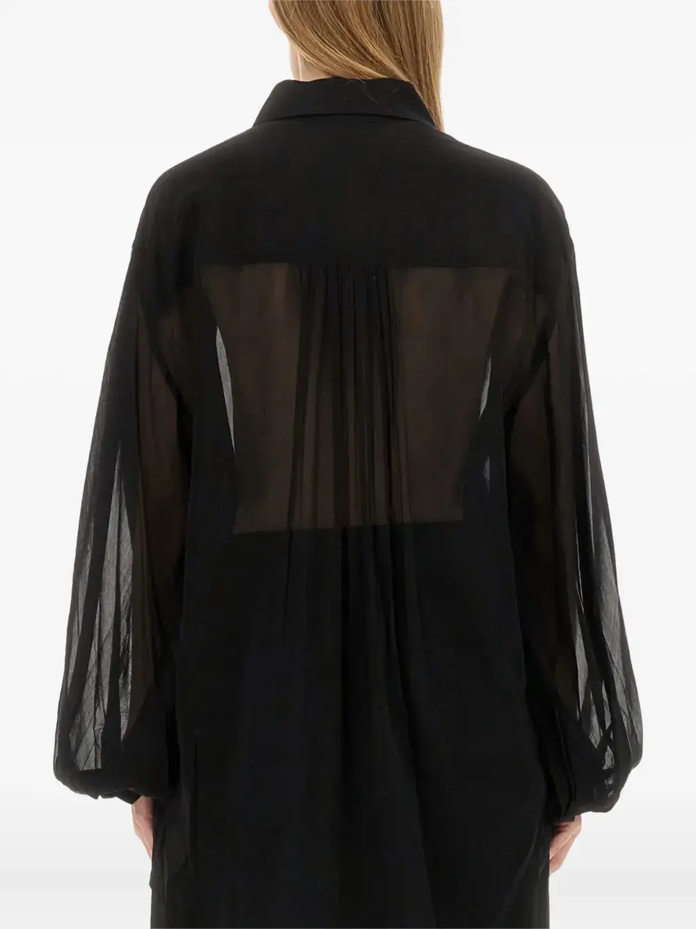 черная прозрачная блузка с рукавами-буфами, застежкой на пуговицы и классическим воротником