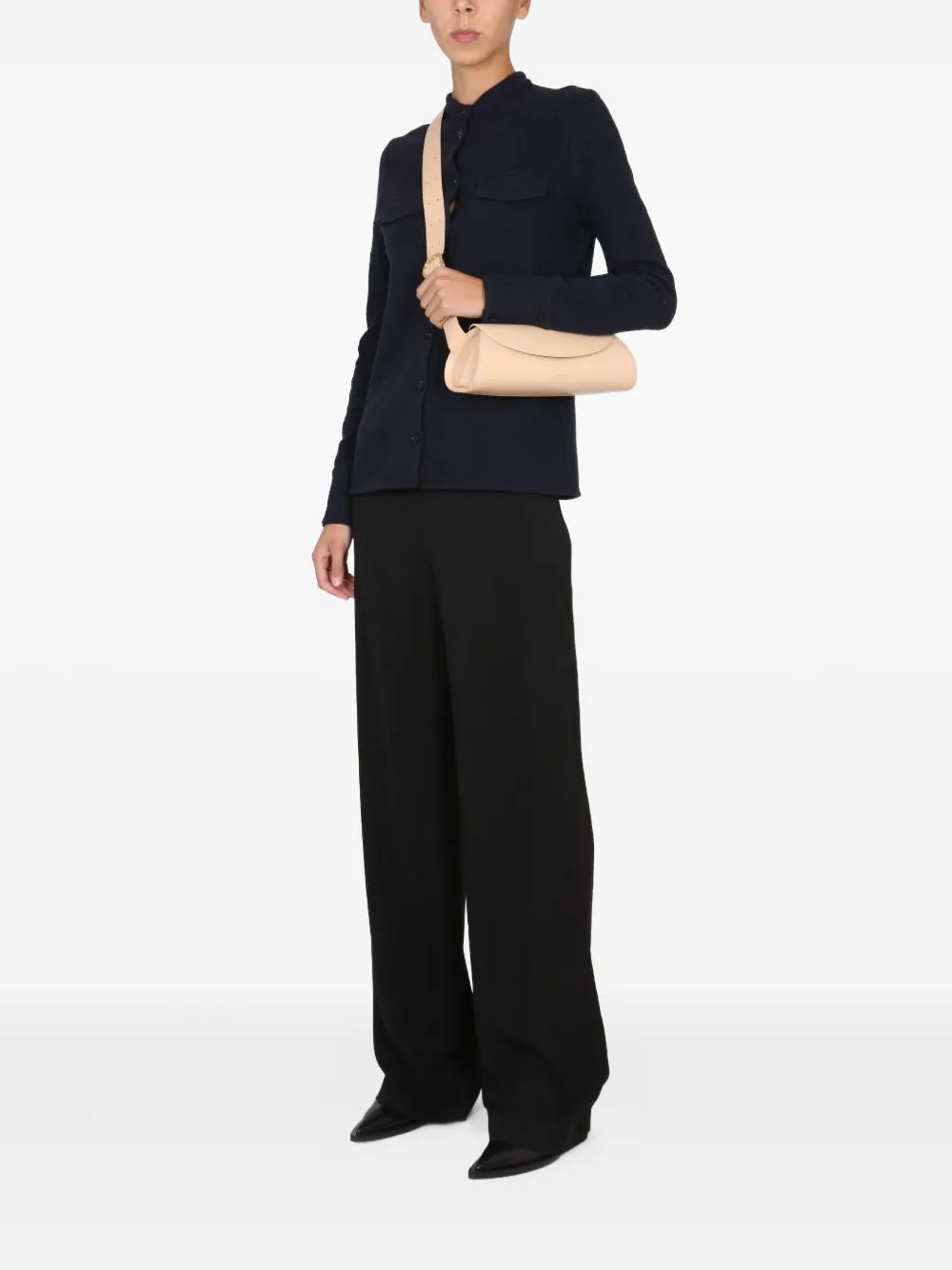 синий цвет, застежка на пуговицы, длинные рукава, два нагрудных кармана, воротник-стойка