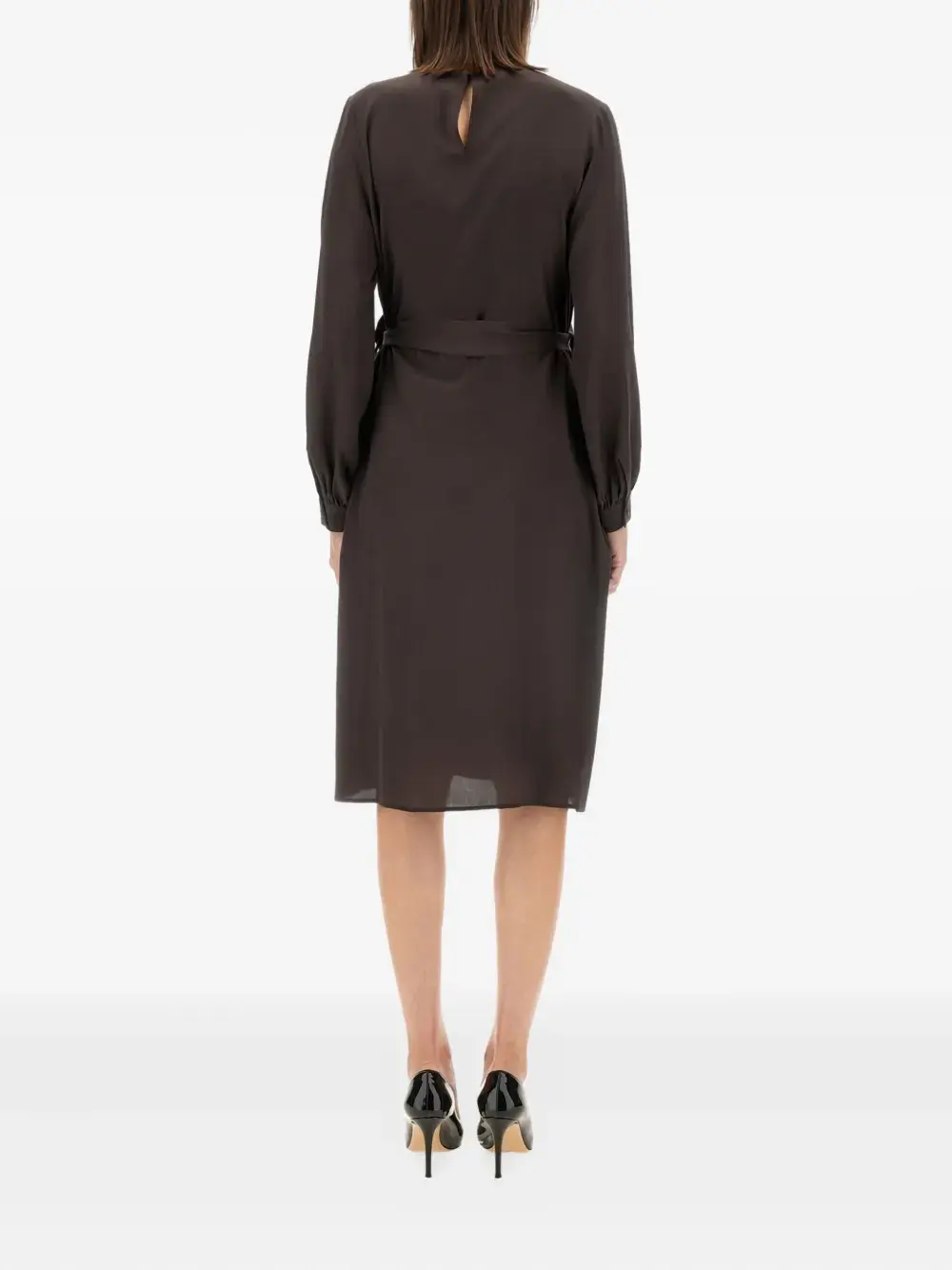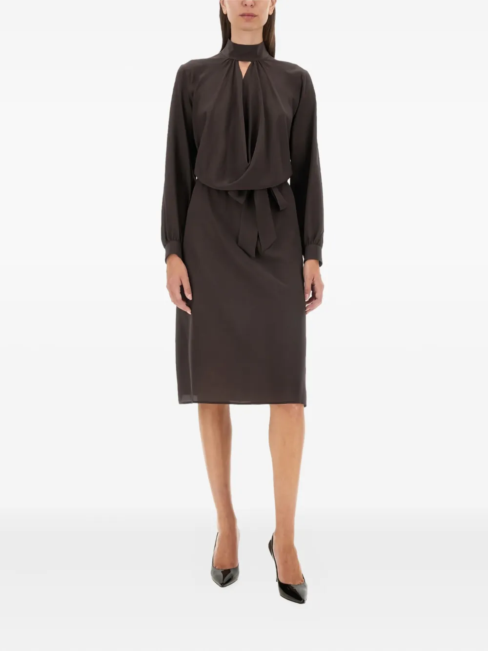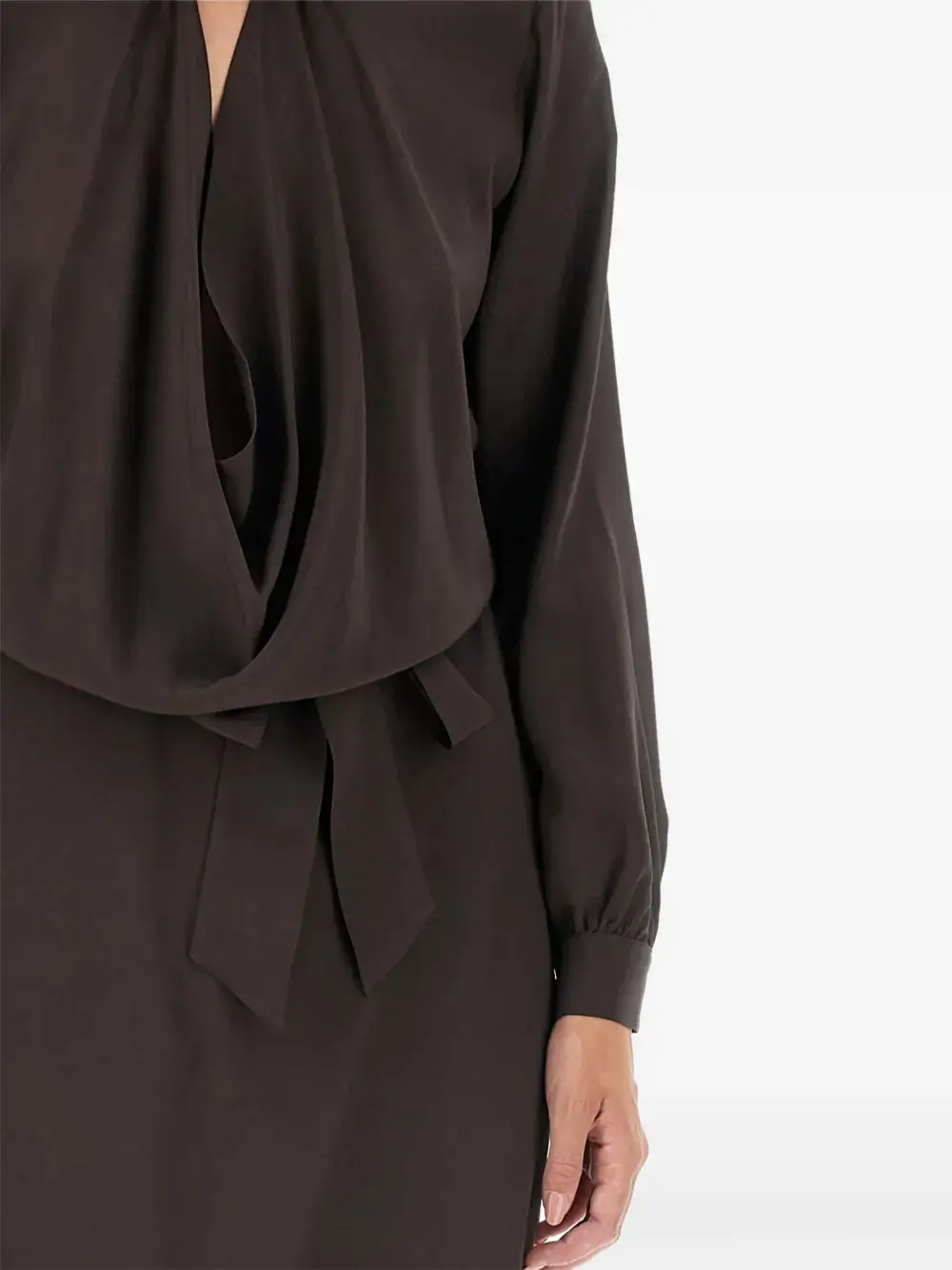 темно-коричневое платье с вырезом-каплей, длинными рукавами и поясом на завязке