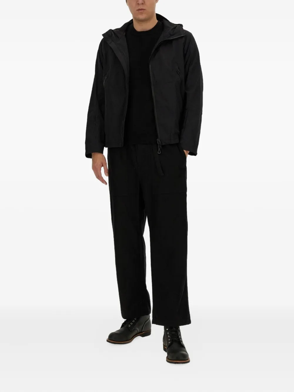 черный капюшон, застежка-молния спереди, передние карманы на молнии, кнопки сзади