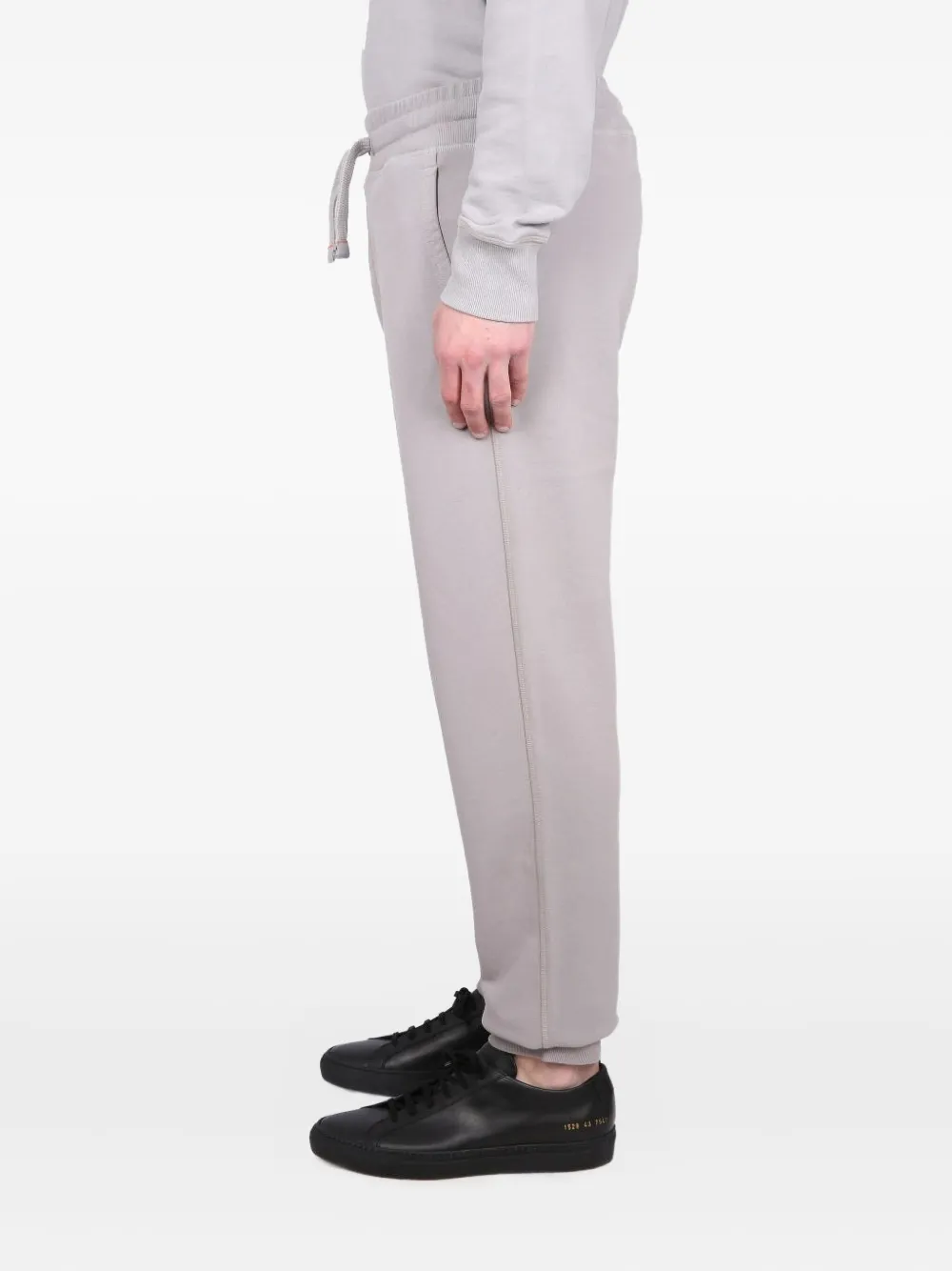 серый цвет, кулиска на талии, задний накладной карман, эластичные манжеты по низу брюк, боковые карманы, тональная строчка
