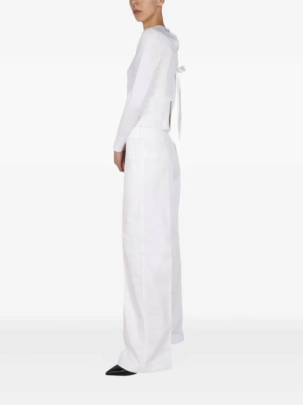 белый топ с завязками на шее, круглым вырезом и длинными рукавами
