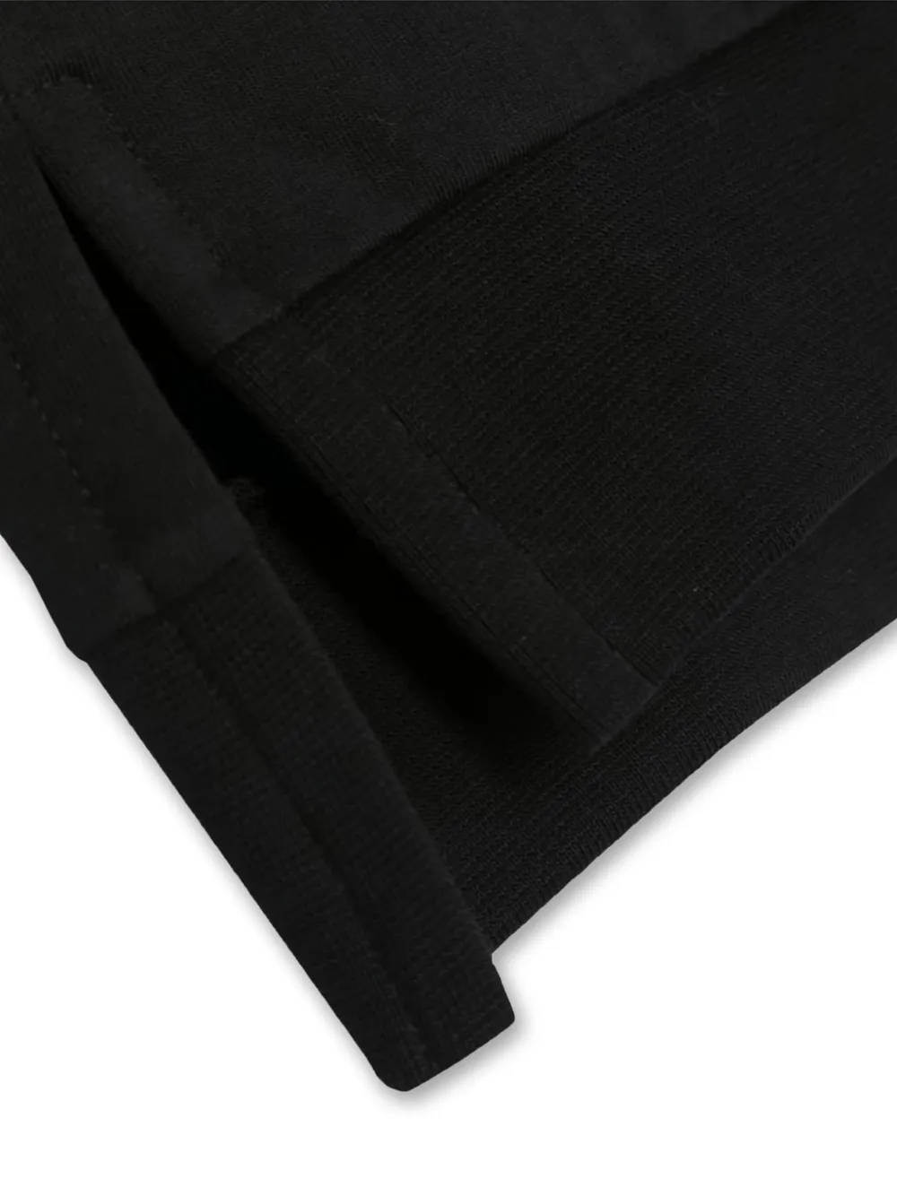 черный лонгслив с графичным мишкой, круглым вырезом, боковыми разрезами и ребристым низом