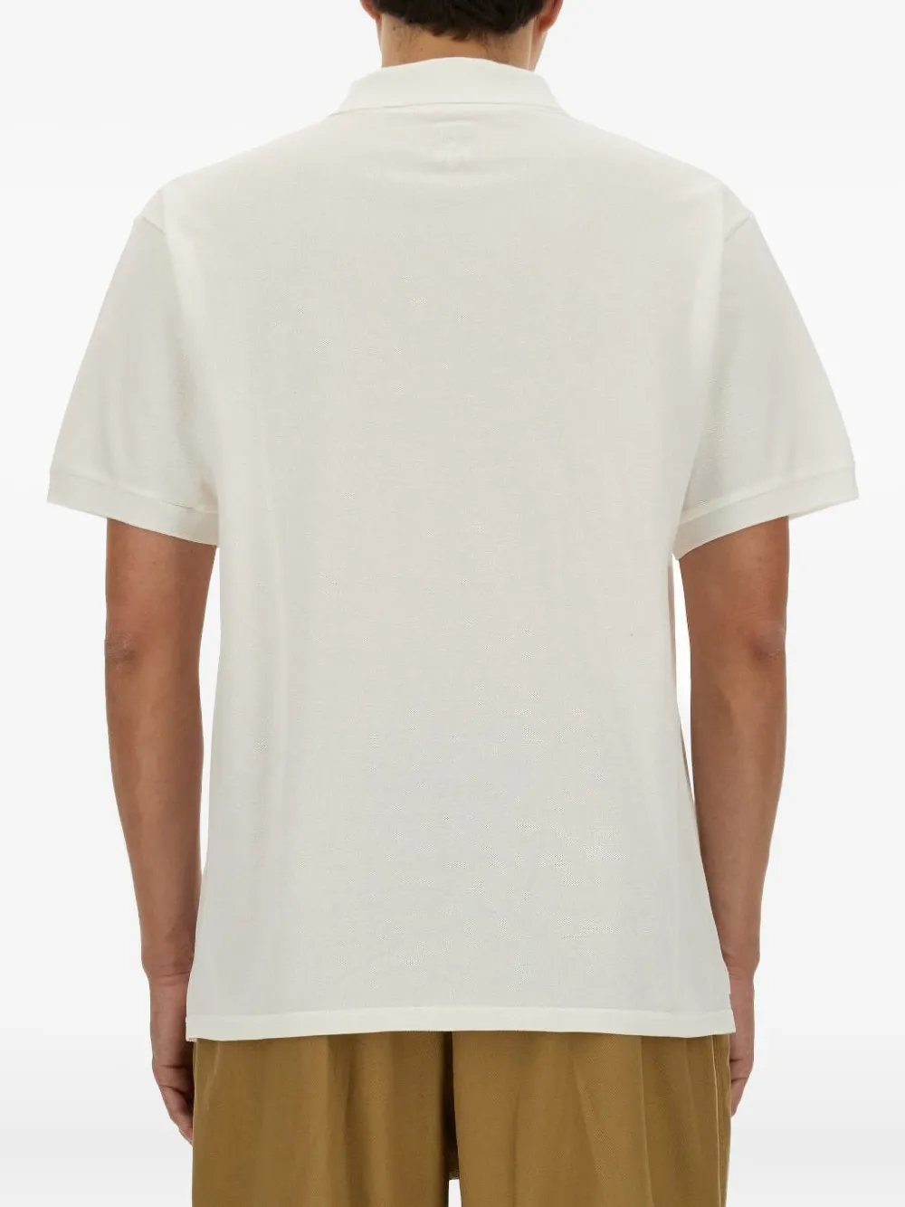 бежевое поло с вышитым логотипом, короткими рукавами, планкой на пуговицах и воротником поло