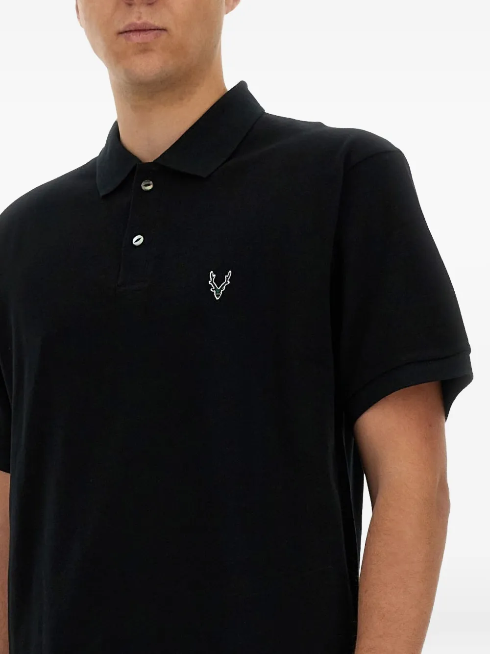 чёрное поло с вышитым логотипом, короткими рукавами, воротником и планкой на пуговицах