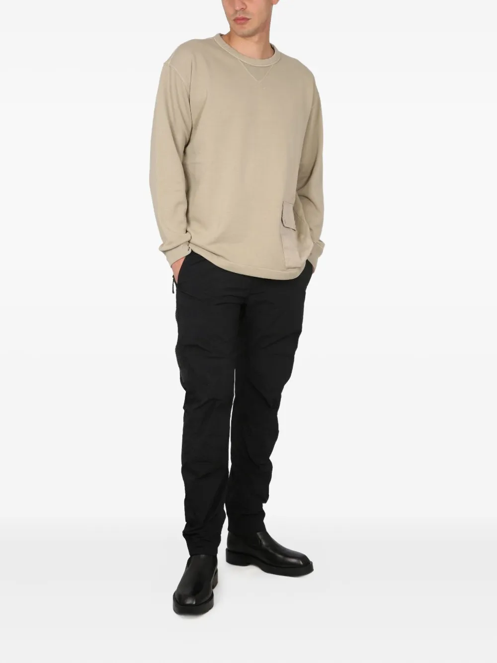 бежевый свитер с круглым вырезом, нагрудным накладным карманом, манжетами и нижним краем в рубчик, с отделкой в виде V-образной строчки