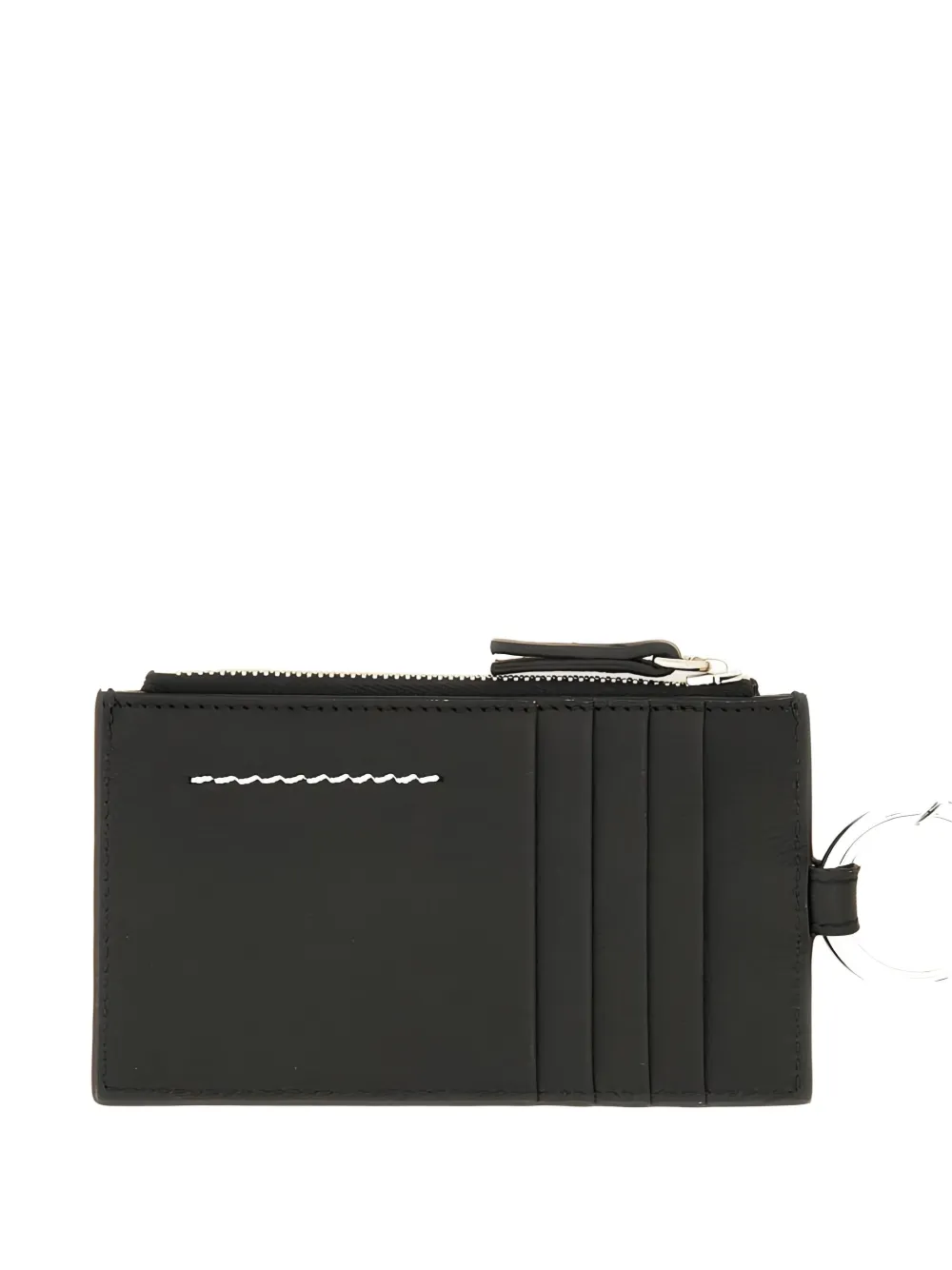 черный кожаный брелок, застежка-молния сверху, задние слоты для карт, фирменная прострочка