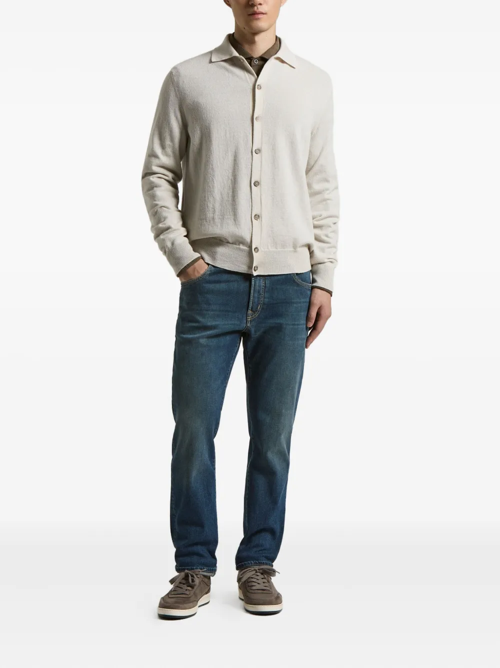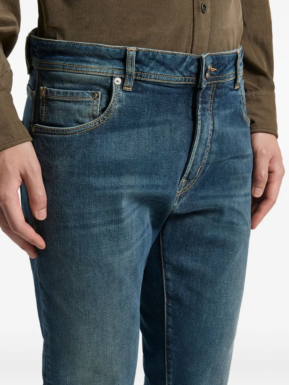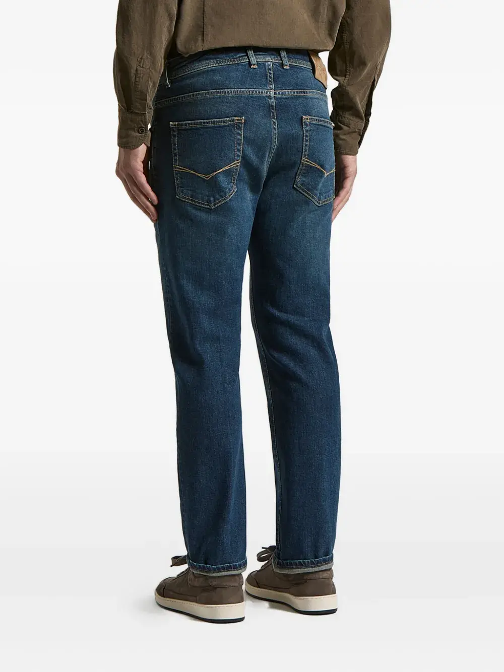 синие шлевки для ремня, пять карманов, нашивка с логотипом сзади, верхняя застежка на пуговицу, однотонная строчка