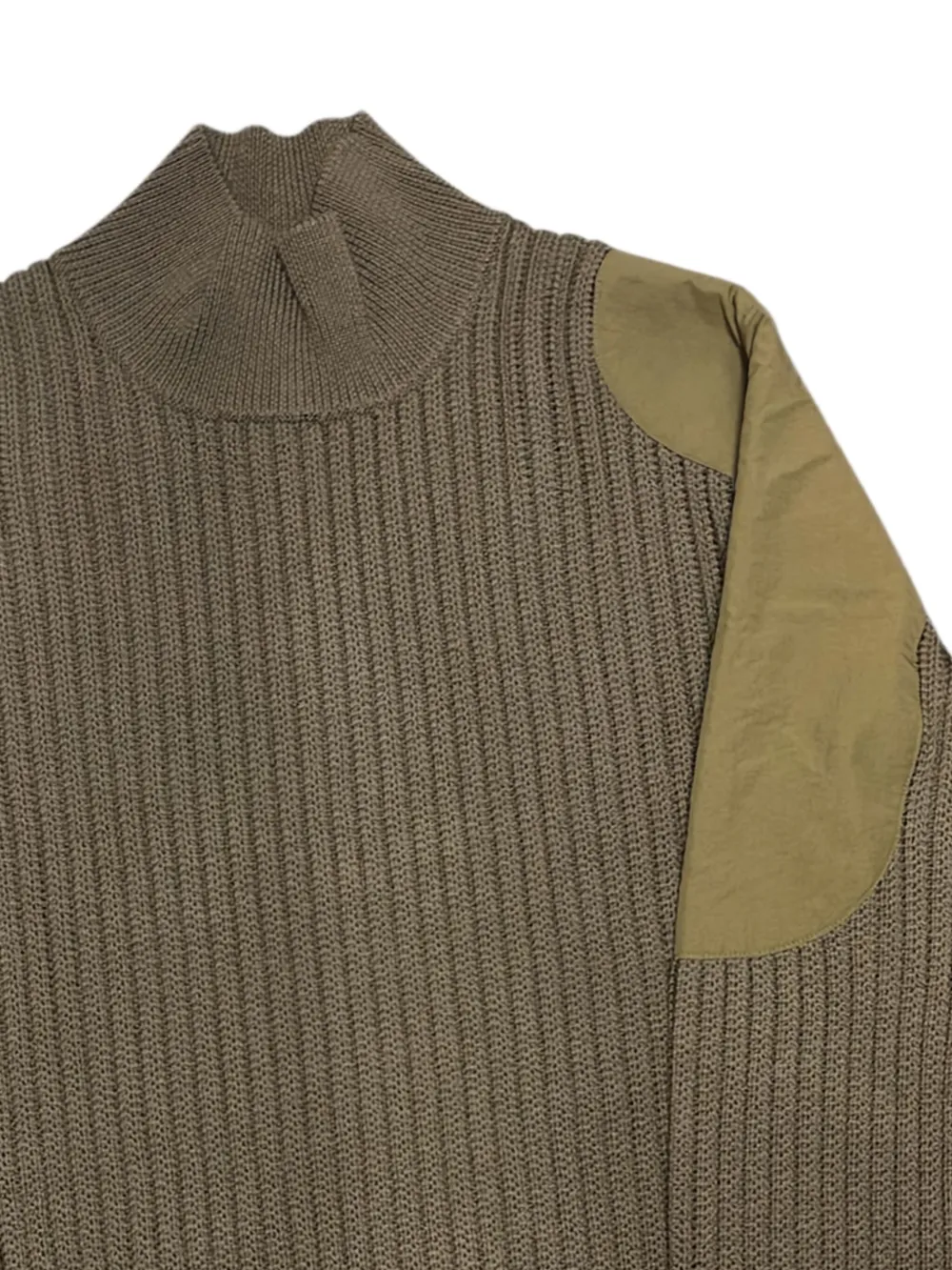 оливково-зеленый трикотаж в рубчик с высоким воротником, панельный дизайн, длинные рукава