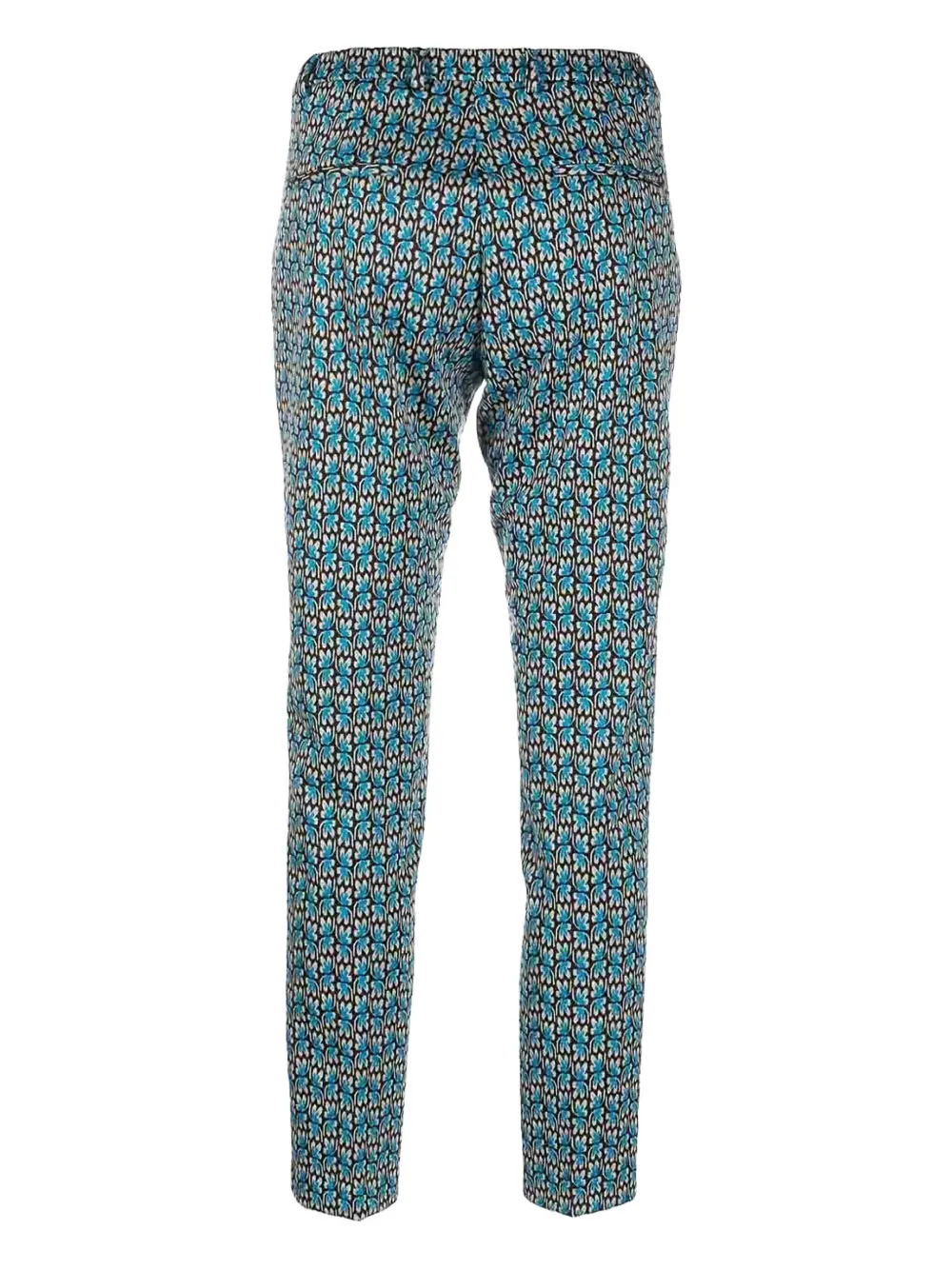 синий и зелёный цветочный принт, застёжка на пуговицы, шлёвки для ремня, боковые карманы в шве, задние прорезные карманы