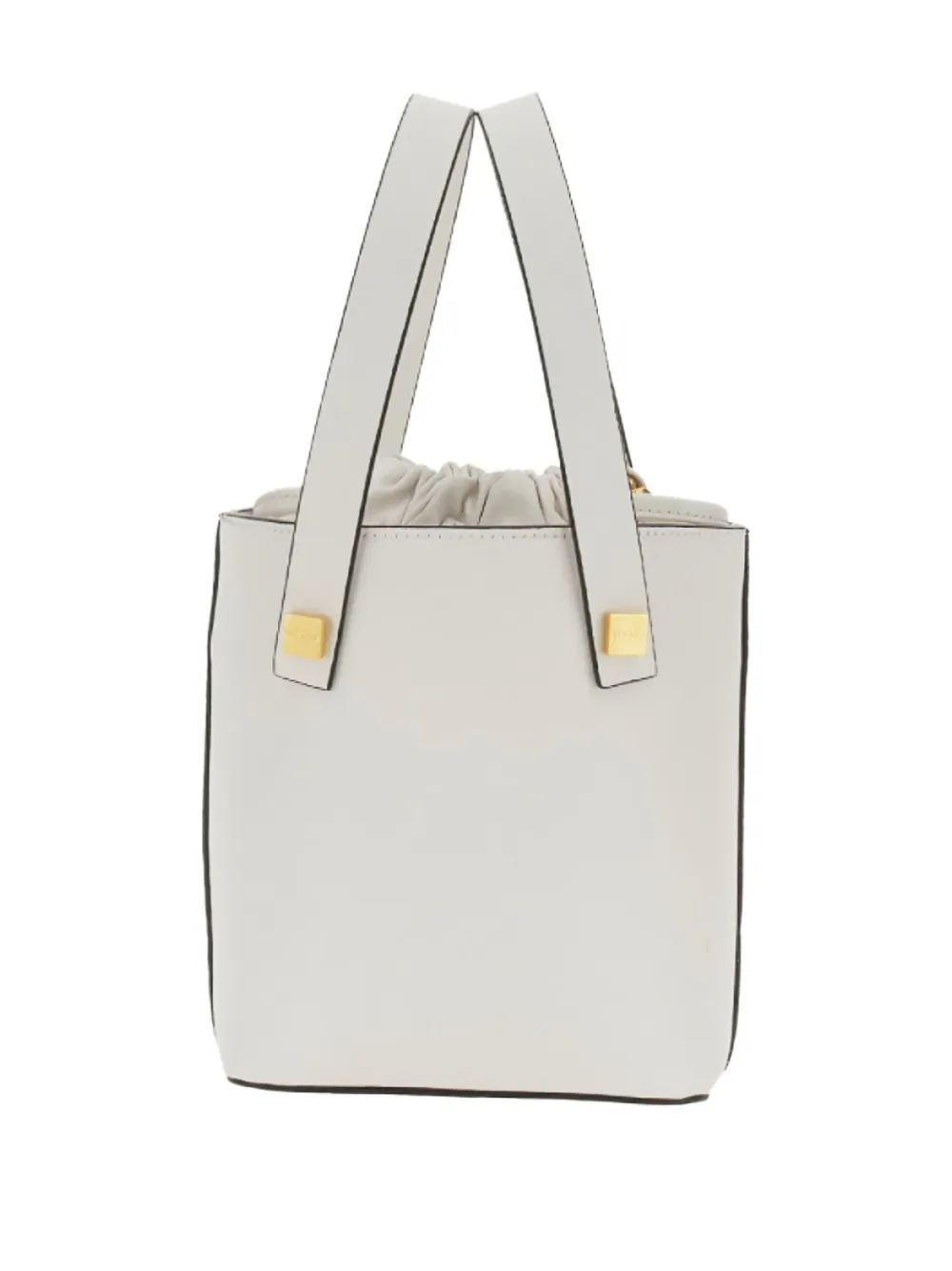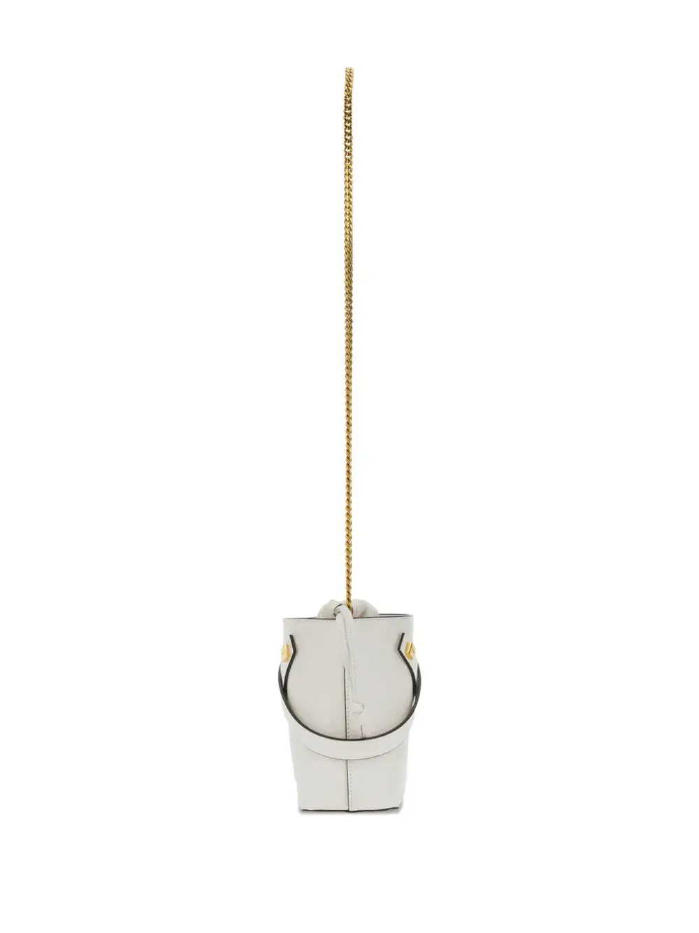 белая сумка с верхней ручкой, фурнитурой золотистого оттенка, плечевым ремешком-цепочкой и затяжкой