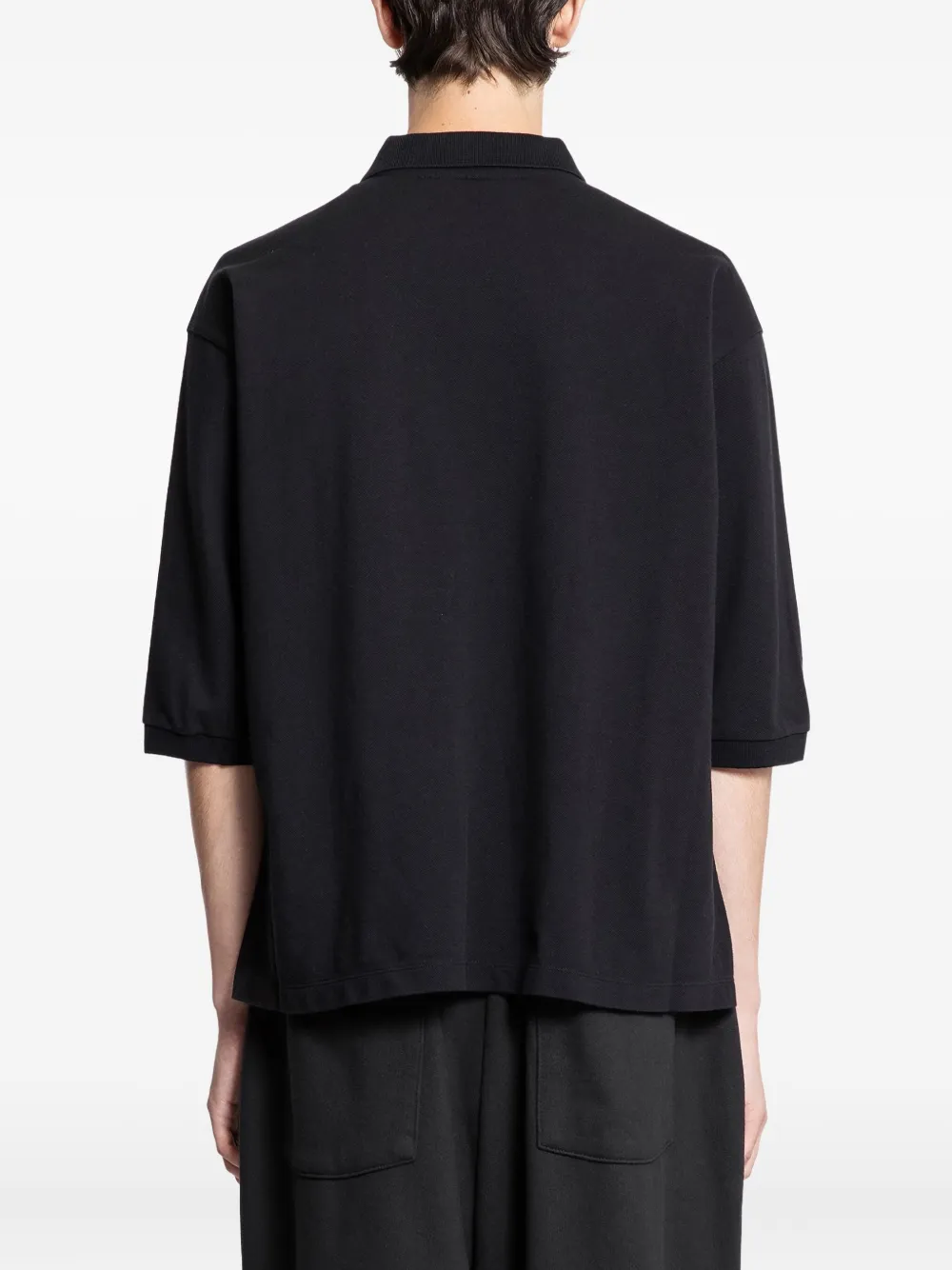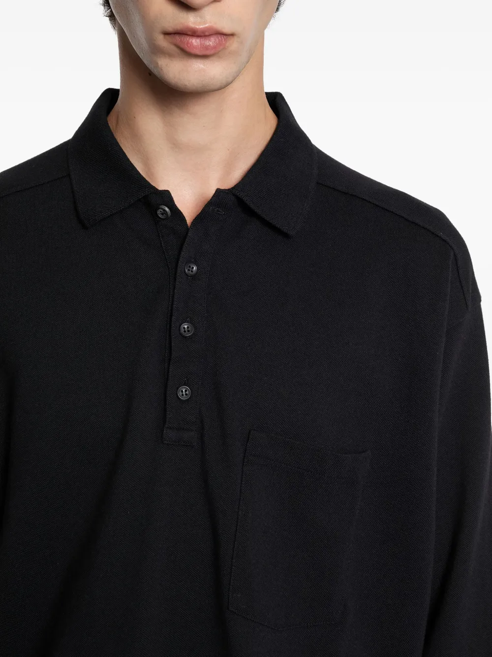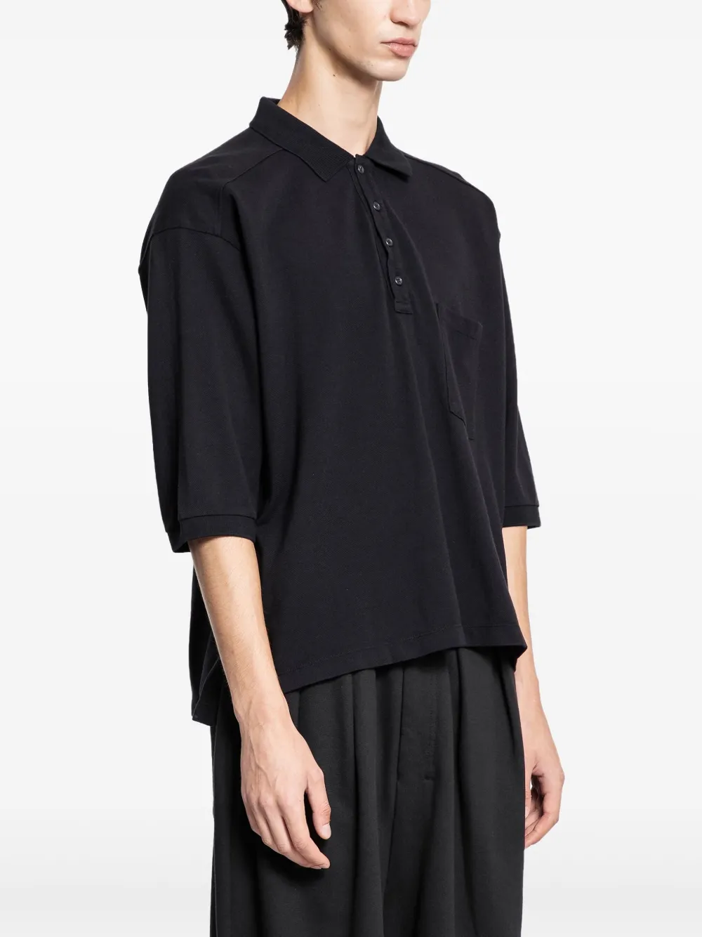 чёрное поло с застёжкой на пуговицы, нагрудным карманом, короткими рукавами и воротником поло