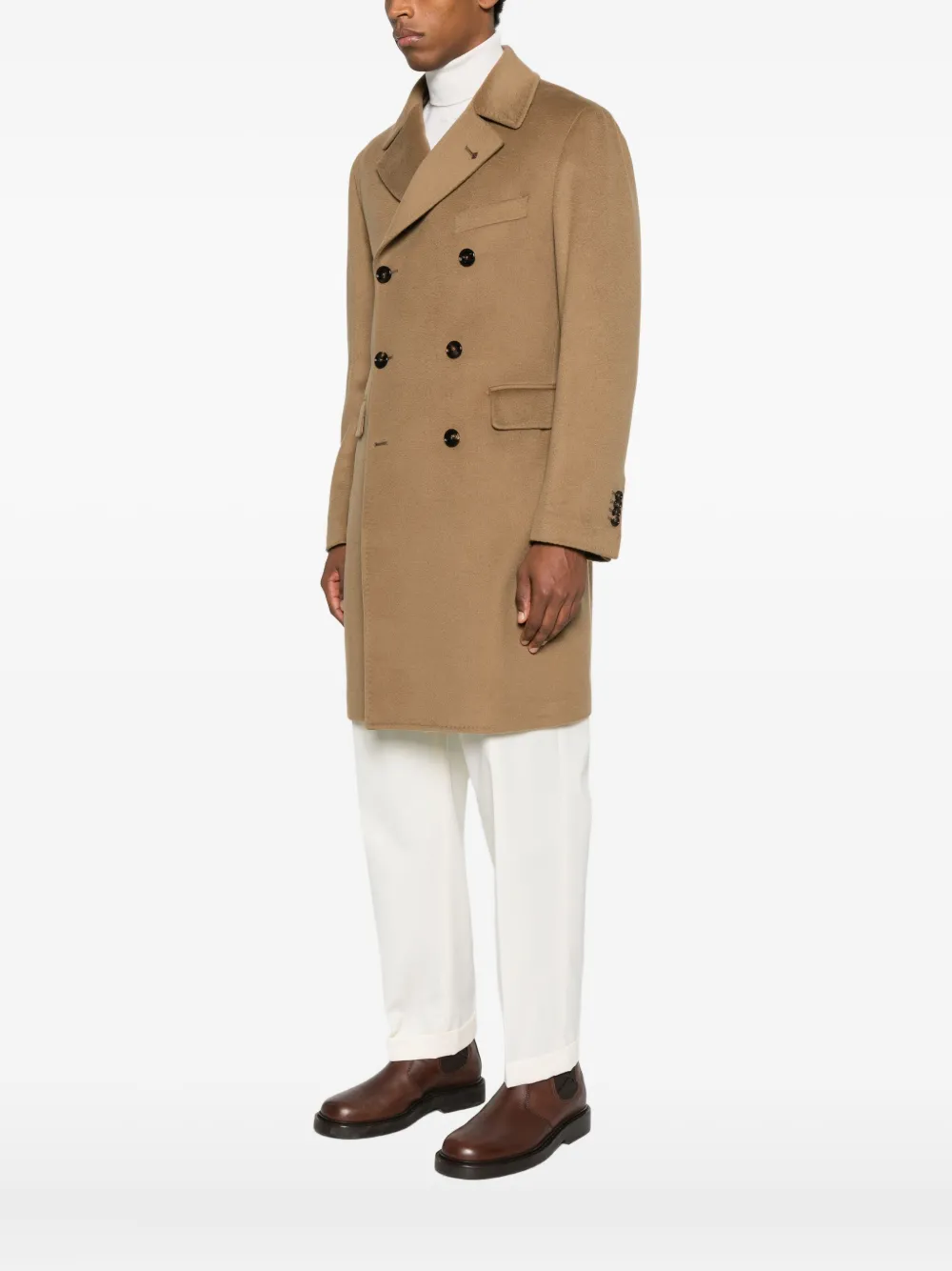 коричневый двубортный пиджак, застежка на пуговицы, лацканы с вырезом, клапанные карманы, нагрудный прорезной карман