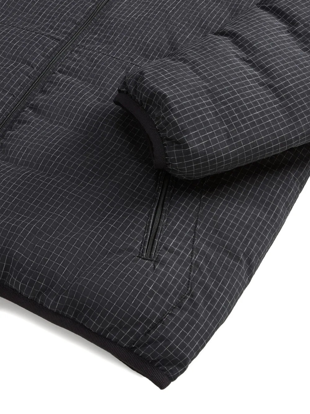 черная куртка с клетчатым узором, застежкой-молнией, высоким воротником, длинными рукавами и эластичными манжетами