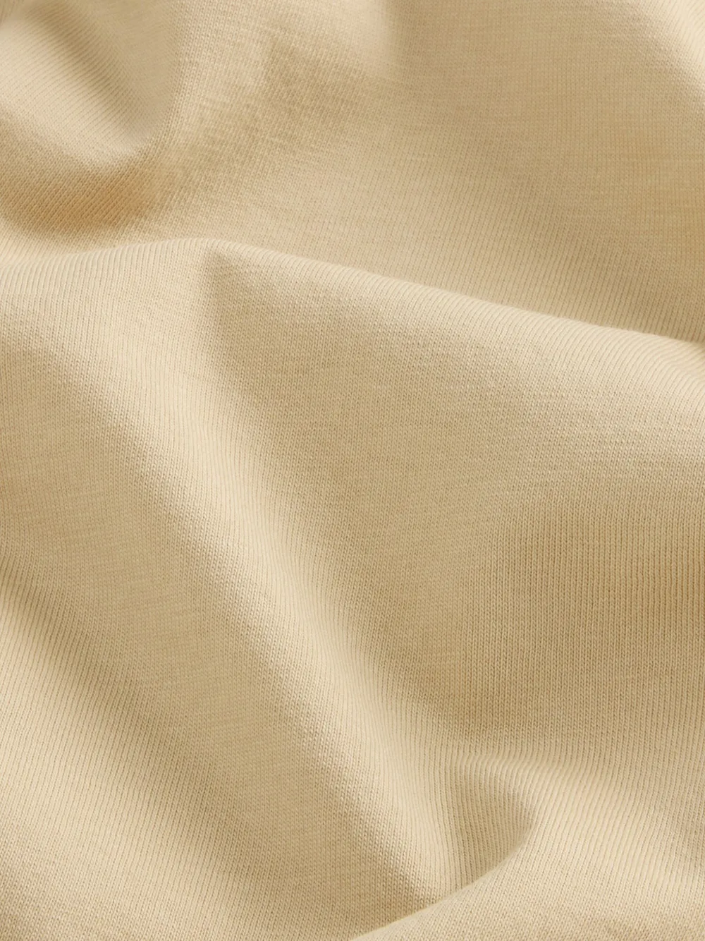 бежевый свитшот с круглым вырезом, графическим принтом, короткими рукавами и тональной прострочкой