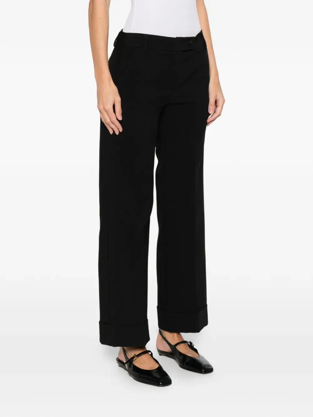 черные с манжетами, застежка на пуговицы, боковые карманы, шлевки для ремня