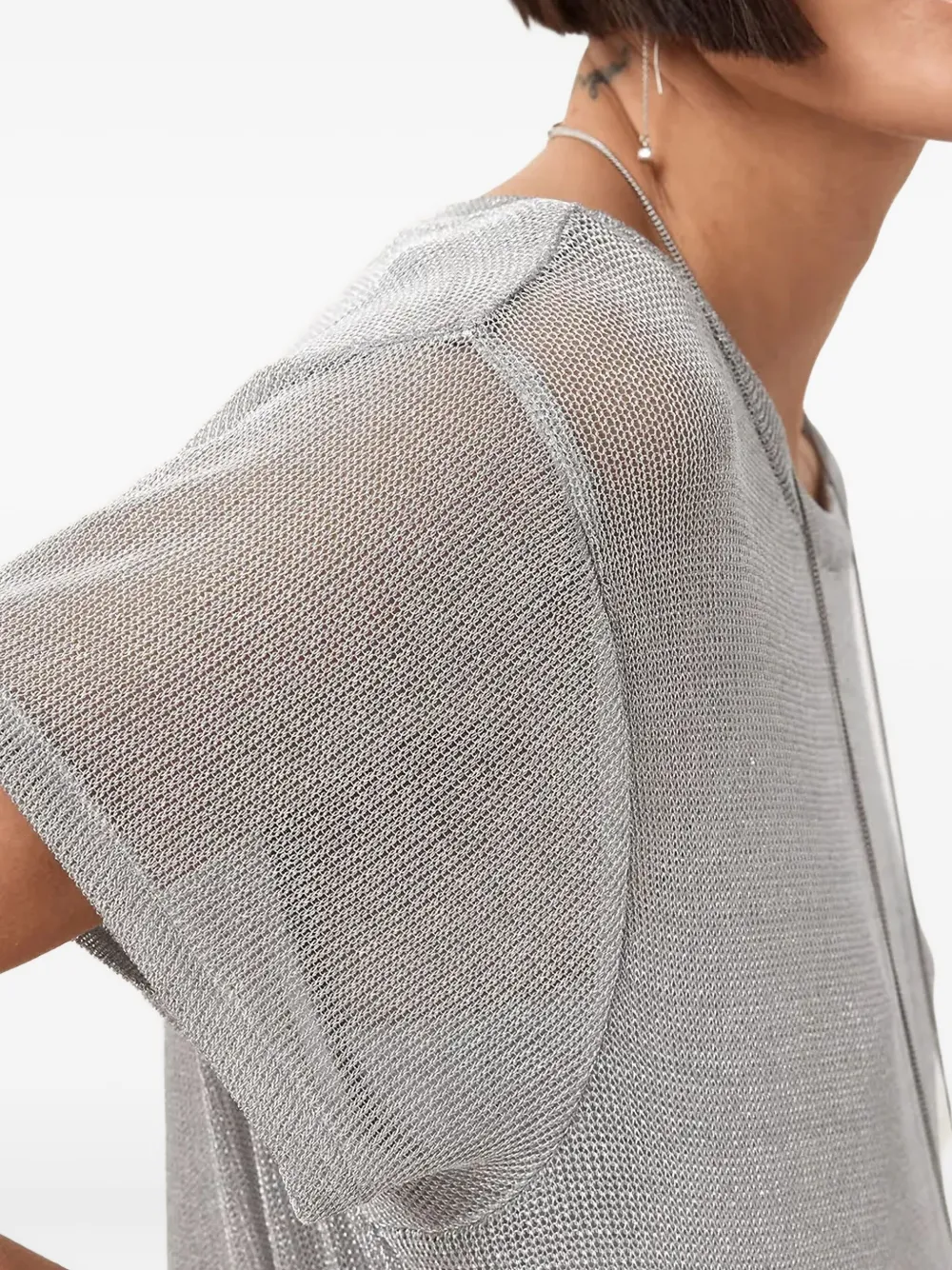 металлическое серебристое короткое платье с рукавами, боковым разрезом, полупрозрачной отделкой и круглым вырезом