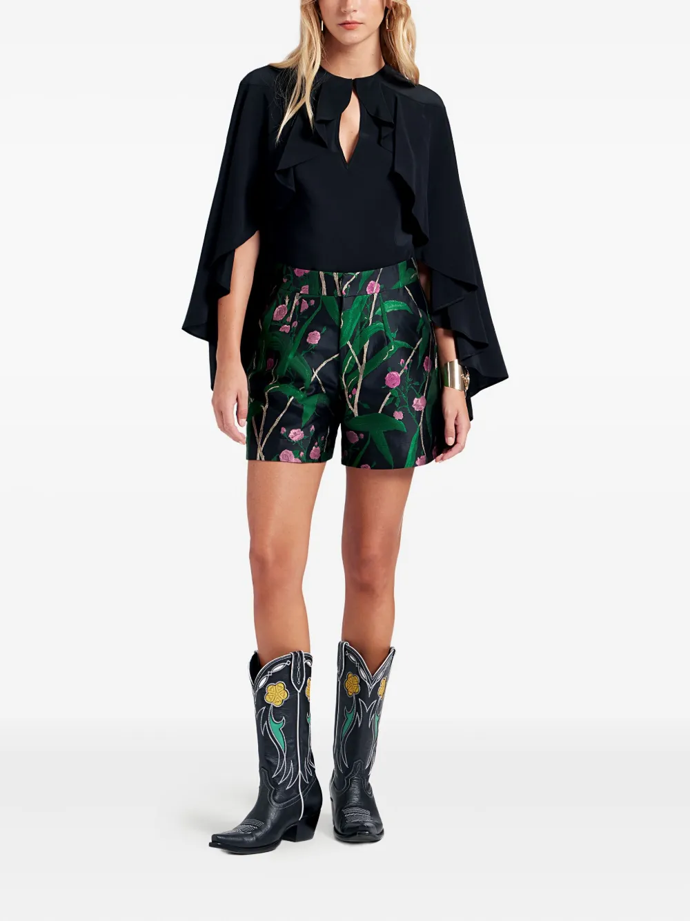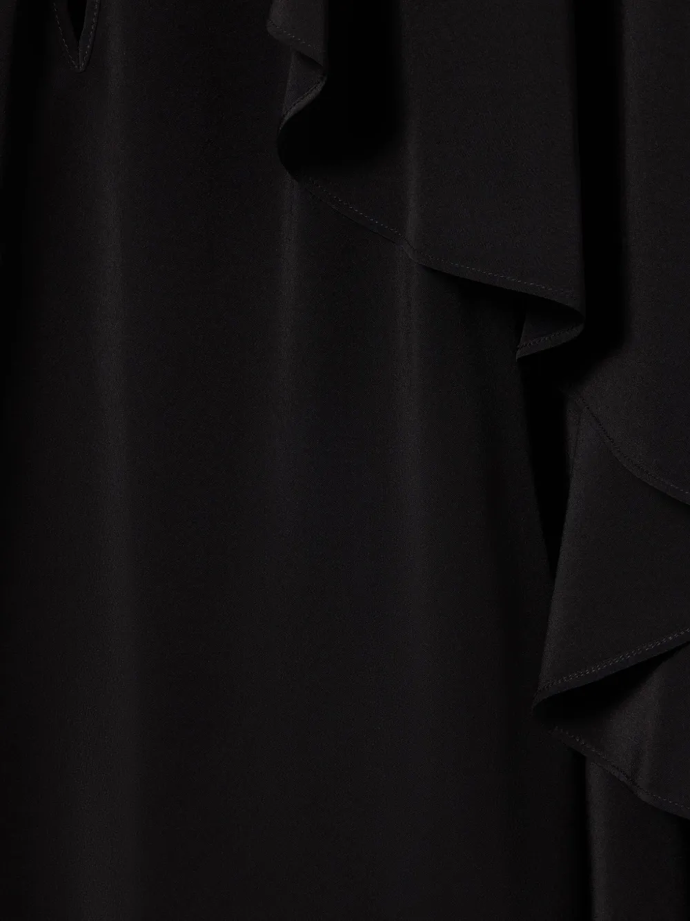 черная шелковая блузка с круглым вырезом, кейп-рукавами и декоративным вырезом