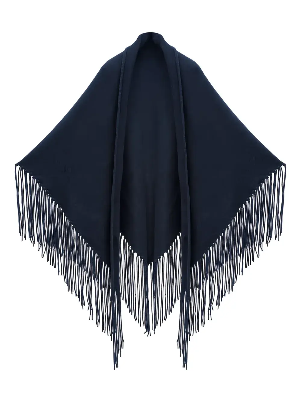 синие лацканы-шаль, открытый перед, бахромчатый подол