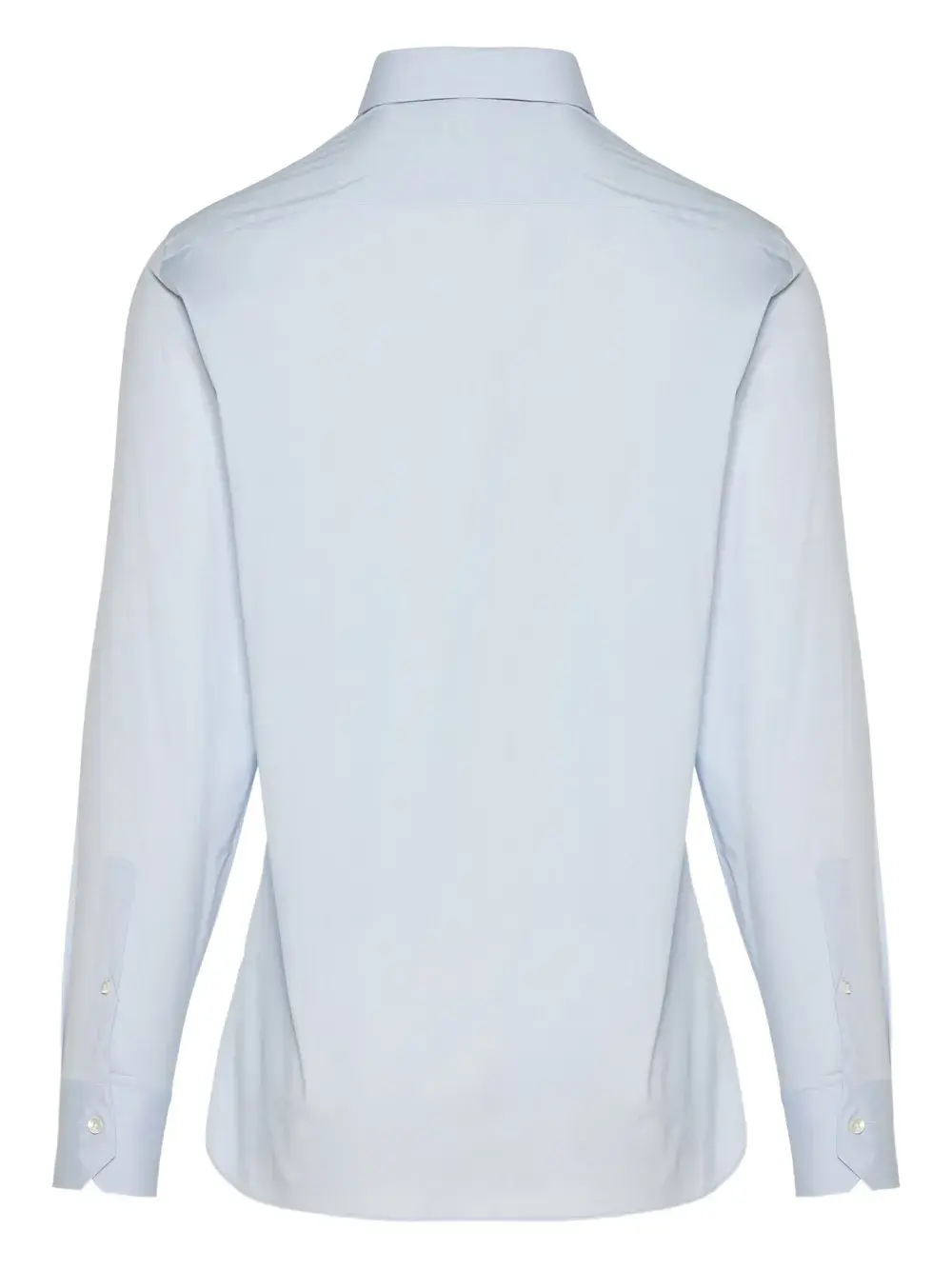 светло-голубая рубашка с застежкой на пуговицы, длинными рукавами, манжетами на пуговицах и классическим воротником