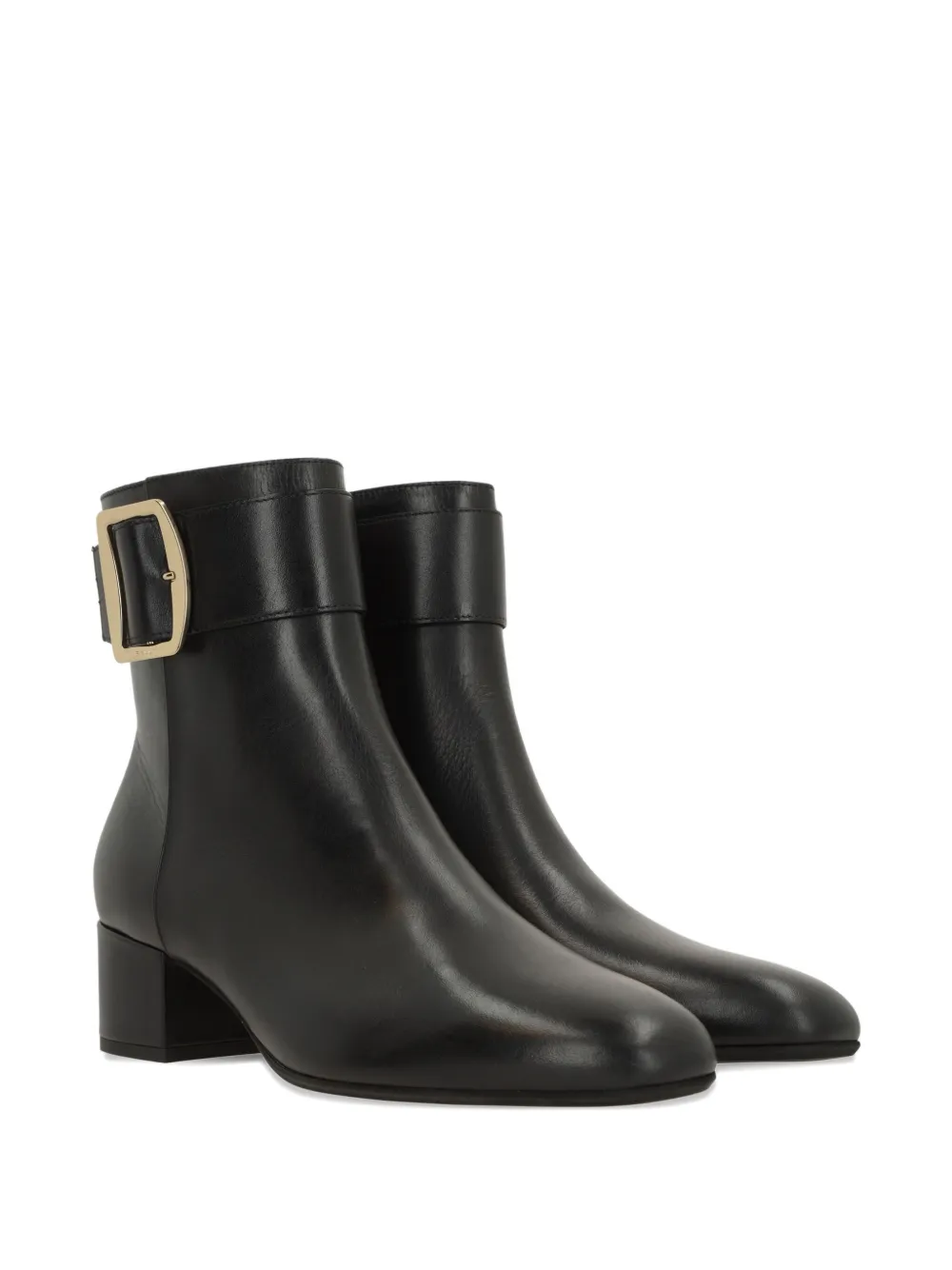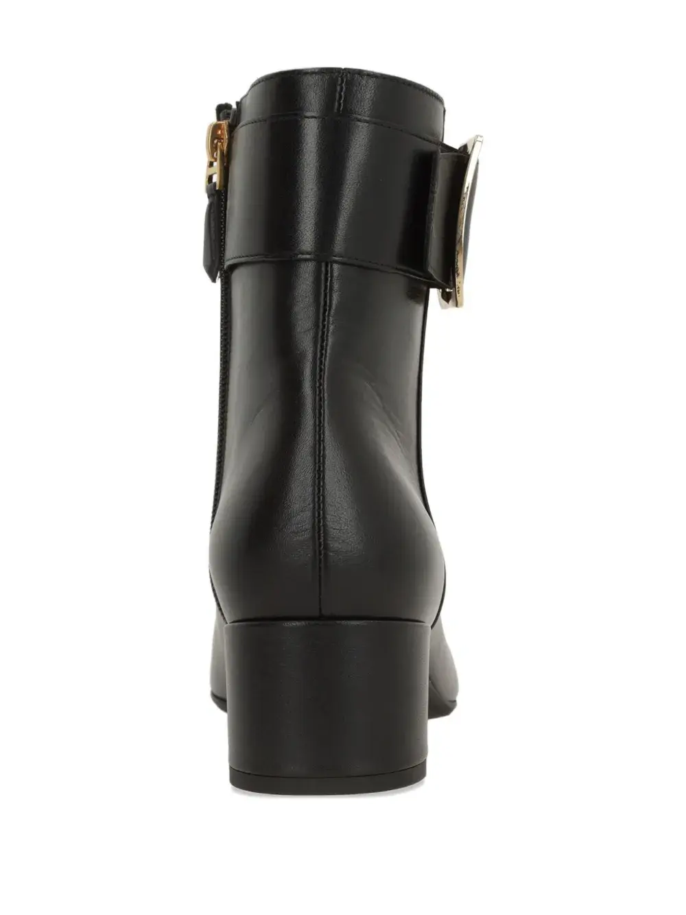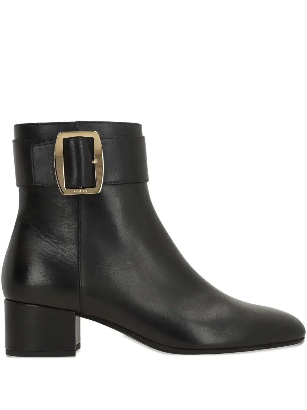 черная кожа теленка, золотистая пряжка, каблук-«рюмочка», ремешок на щиколотке, боковая застежка-молния
