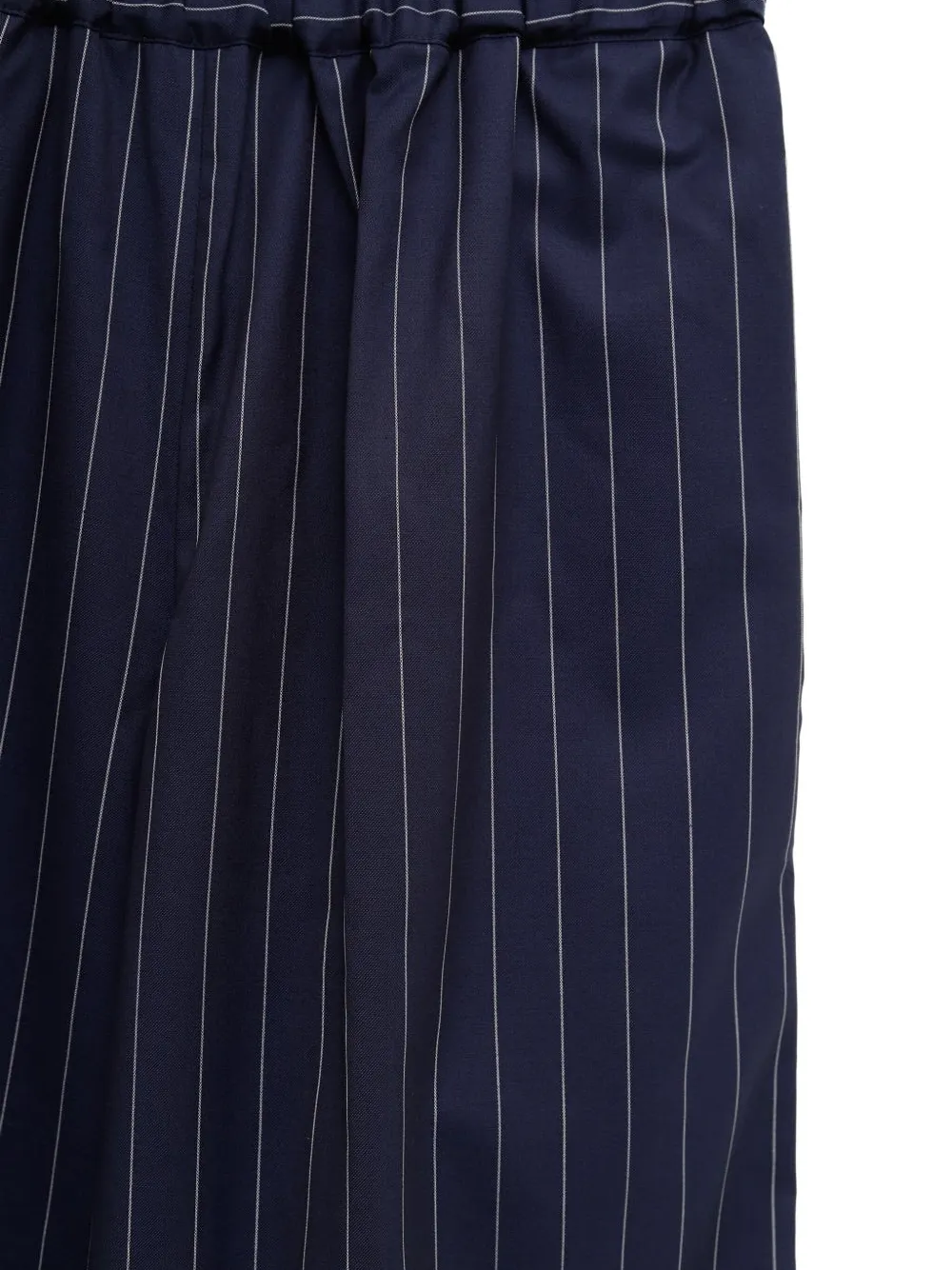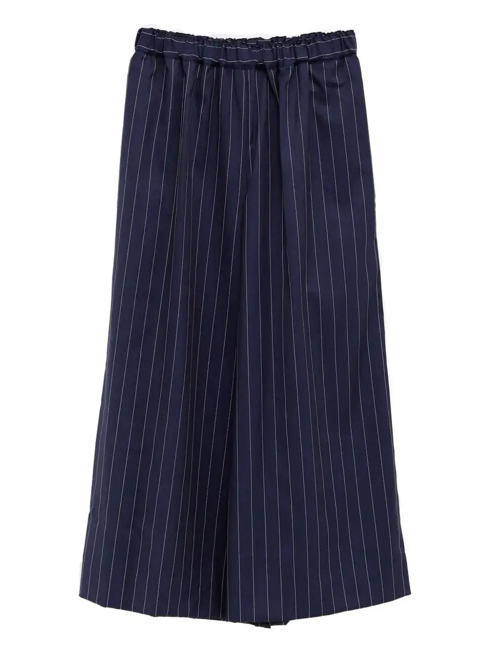 темно-синий с полосками, эластичный пояс, боковые разрезы, укороченная длина