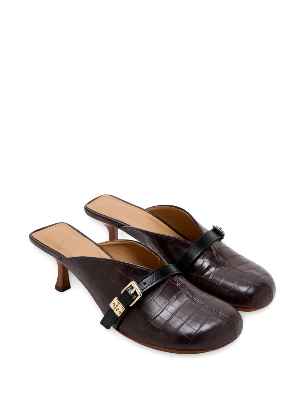 коричневые мокасины с тиснением под крокодила, декоративной пряжкой, без застёжки, с круглым носком