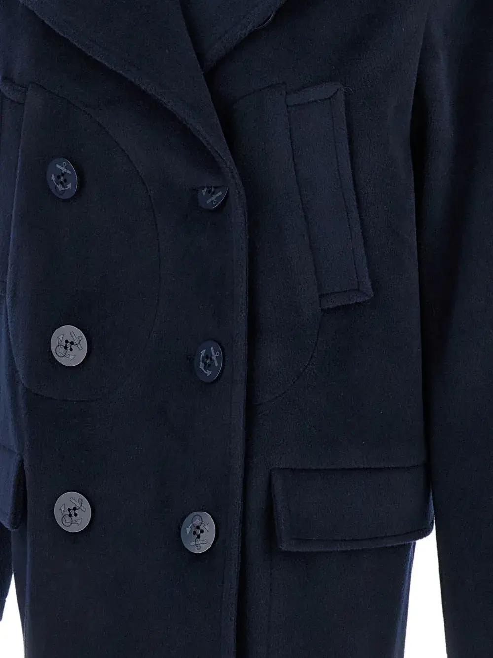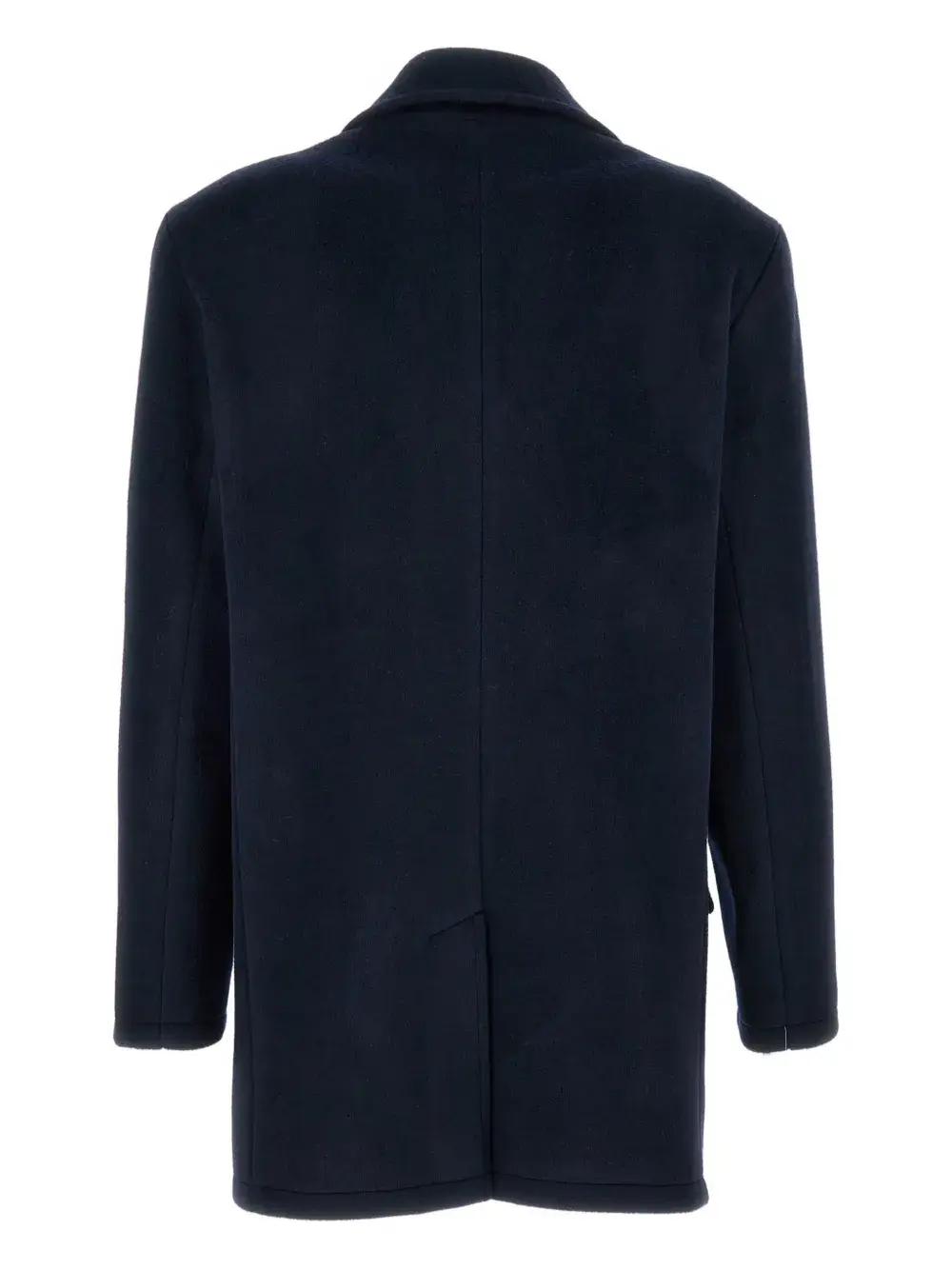 синий двубортный пиджак с застежкой на пуговицы, лацканами с вырезом, клапанными карманами и нагрудным карманом