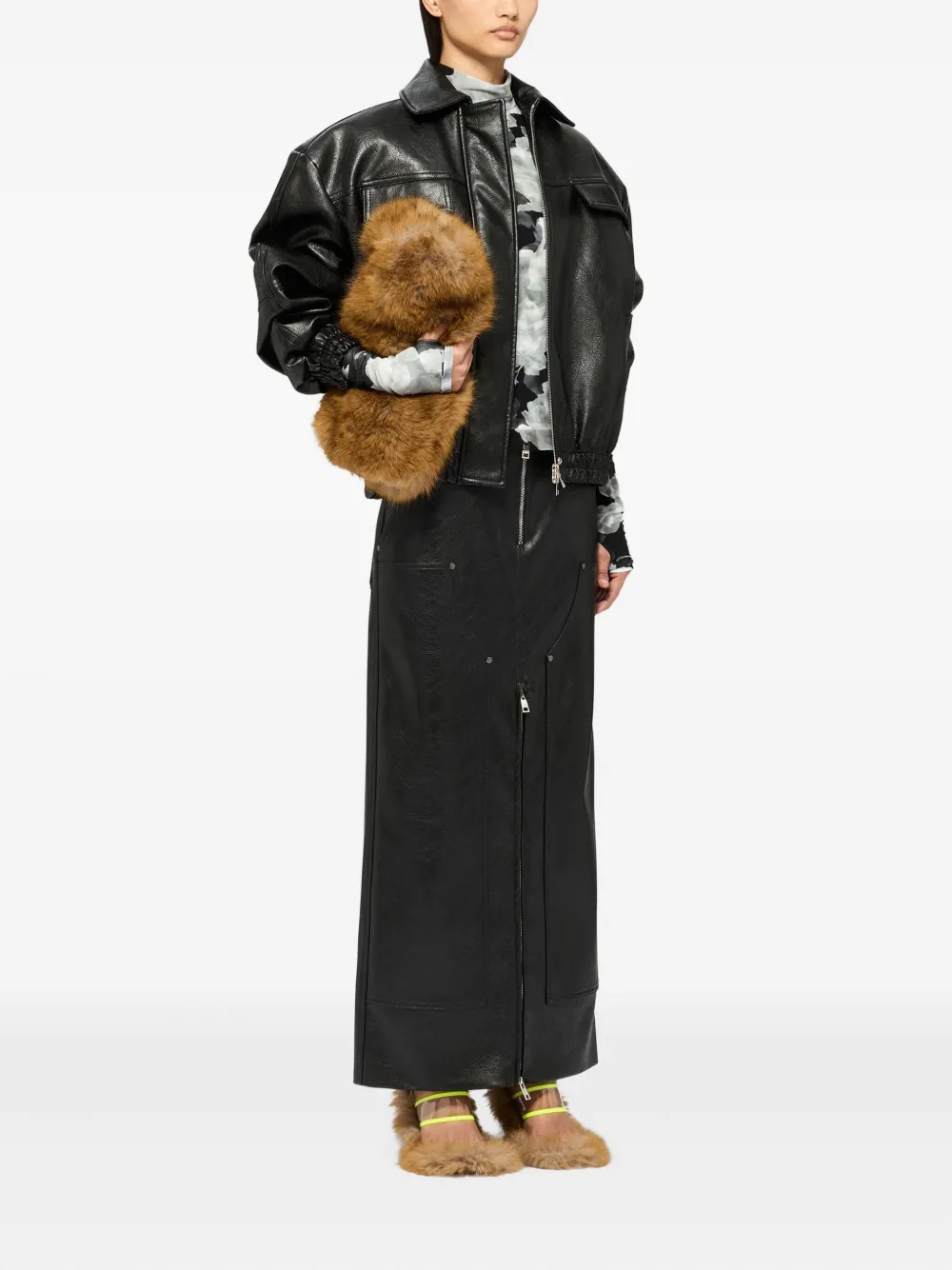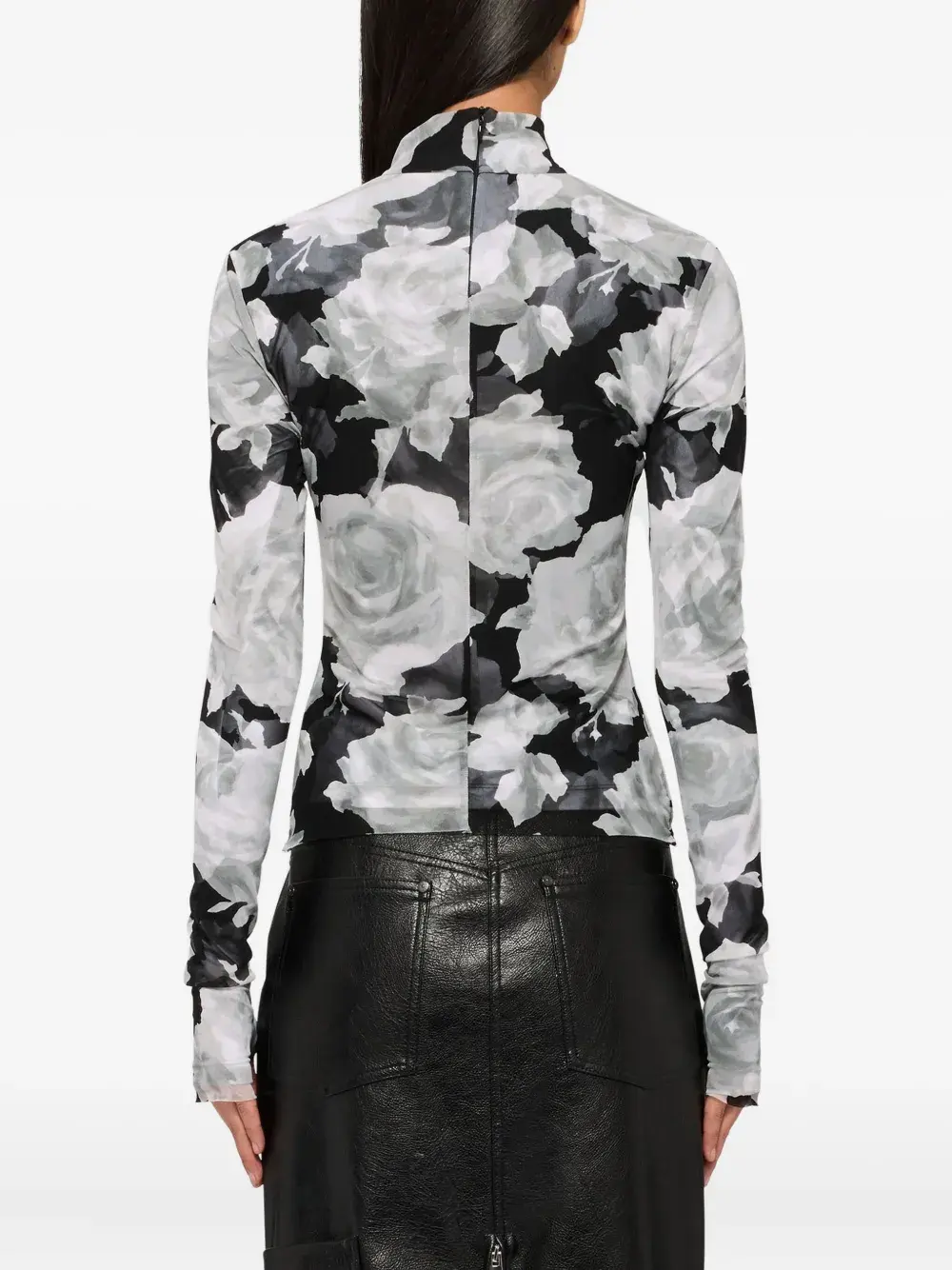черная блузка с цветочным принтом, длинными рукавами и застежкой-молнией