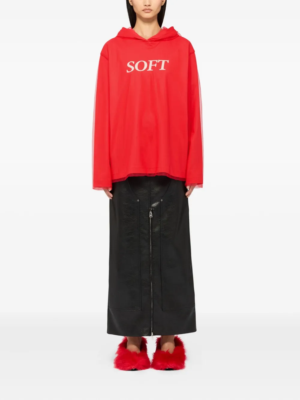 красный худи с длинными рукавами, надпись спереди, надпись сзади