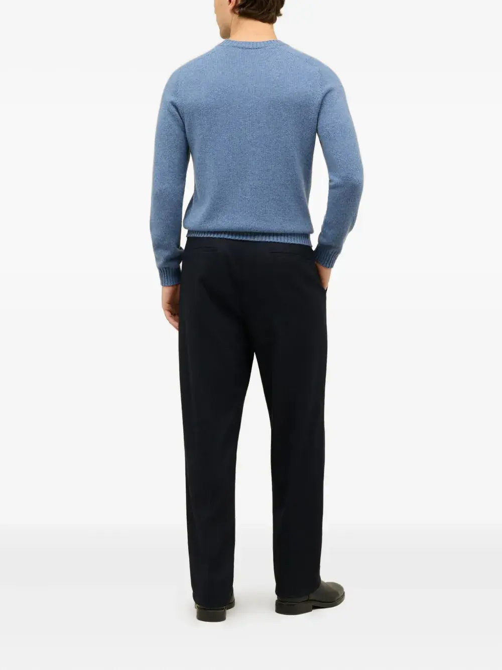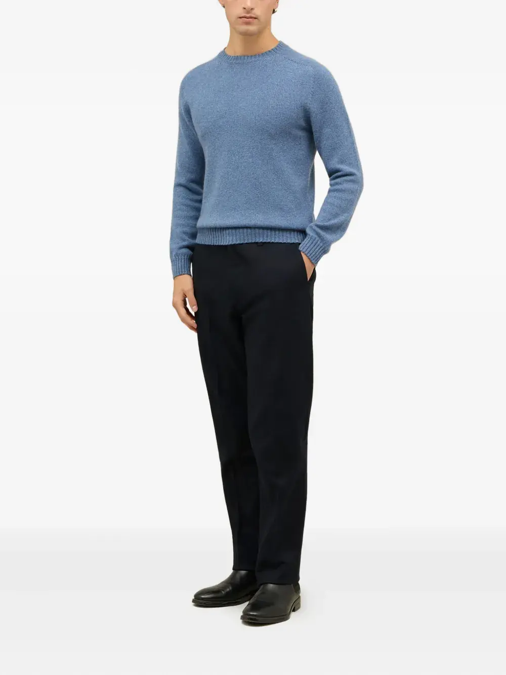 темно-синие брюки с деталями на пуговицах, шлевками для ремня, боковыми карманами в швах, прорезными задними карманами и застежкой на пуговицах
