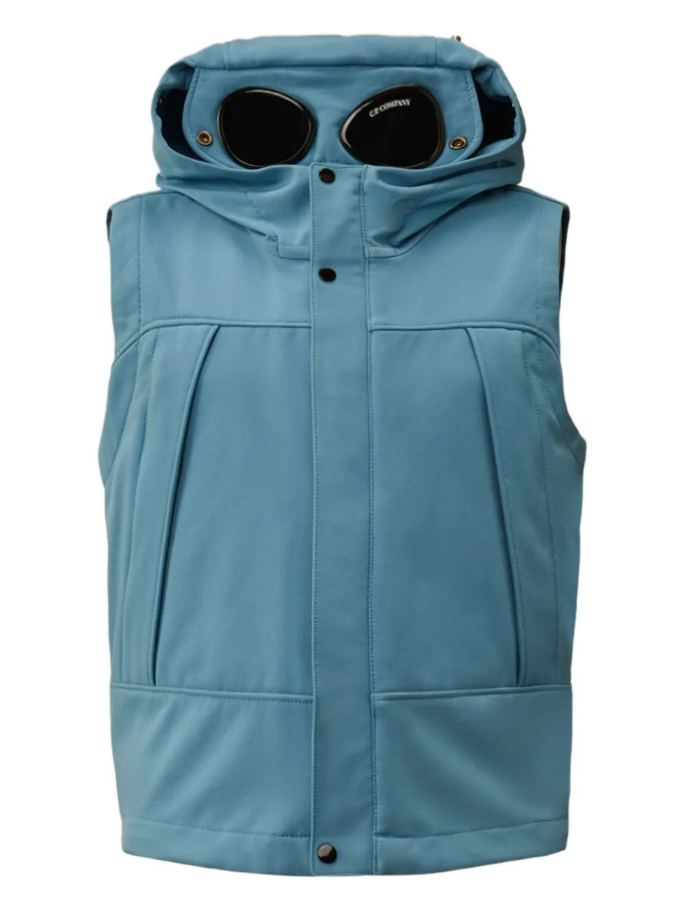 синий жилет с капюшоном, c деталями в виде очков, застежкой на кнопках и панельной конструкцией, C,P, Company рекомендует снимать все съемные аксессуары перед стиркой