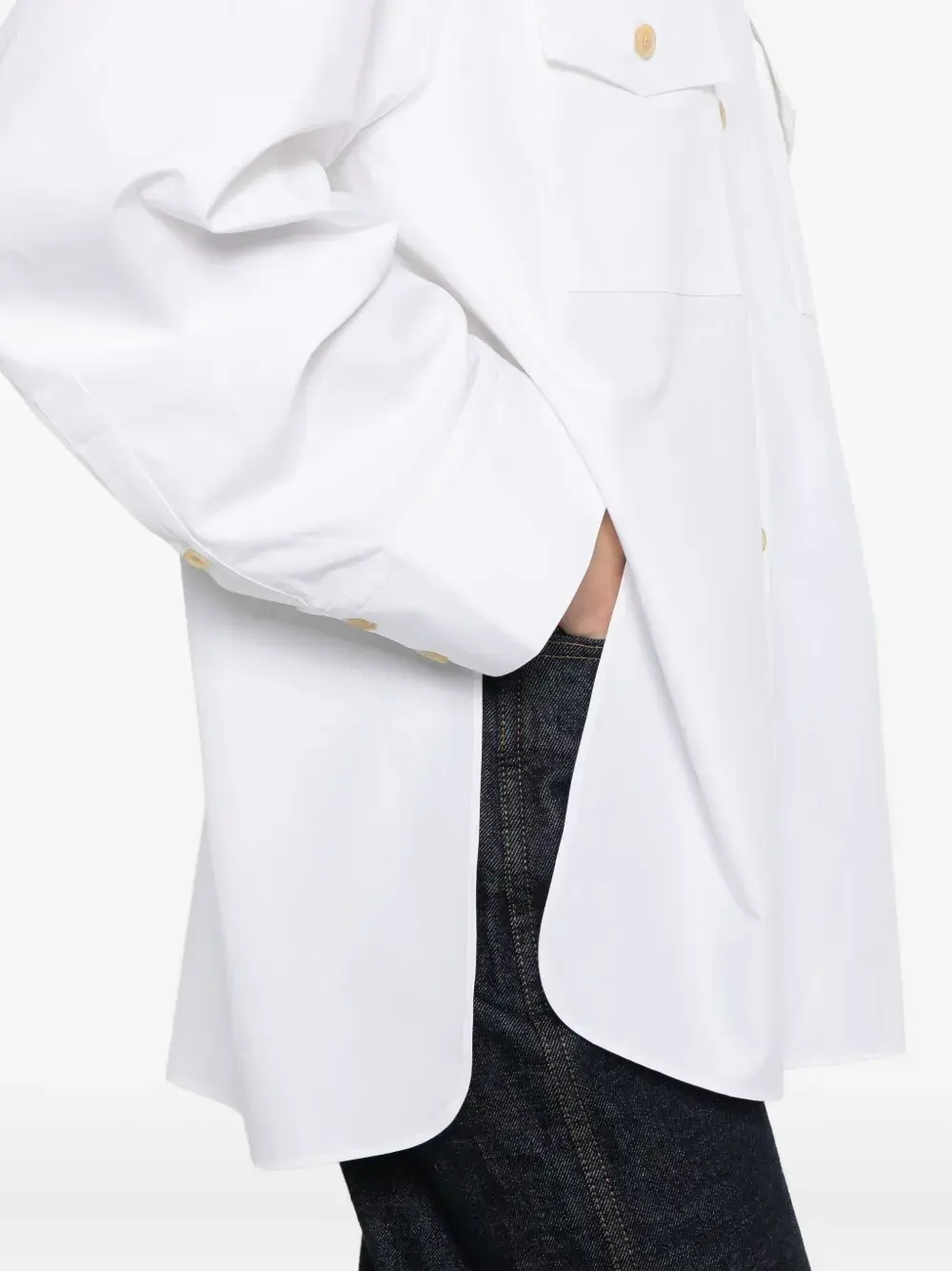 белый цвет, нагрудные карманы, застежка на пуговицы, длинные рукава, манжеты на пуговицах, закругленный подол