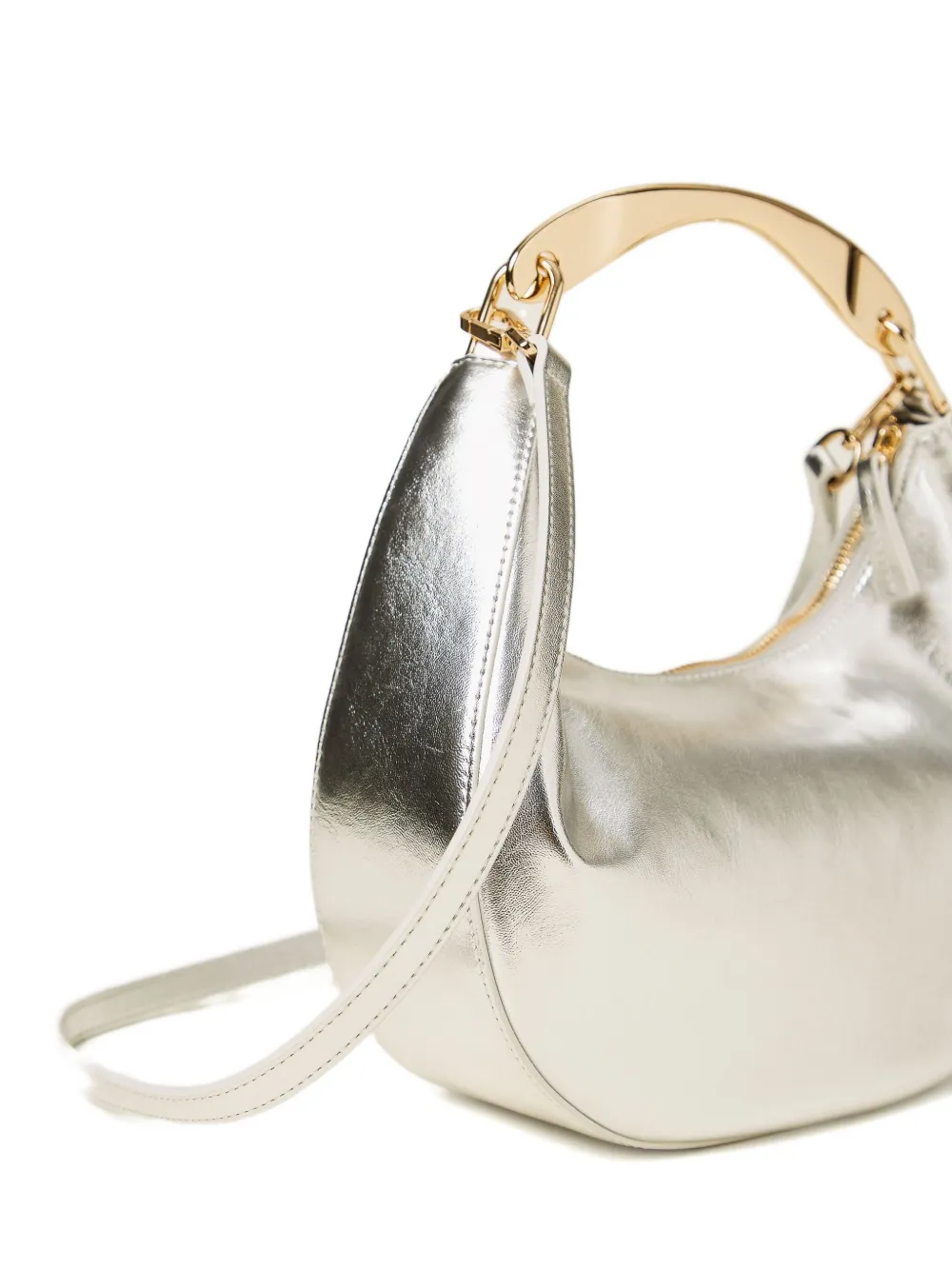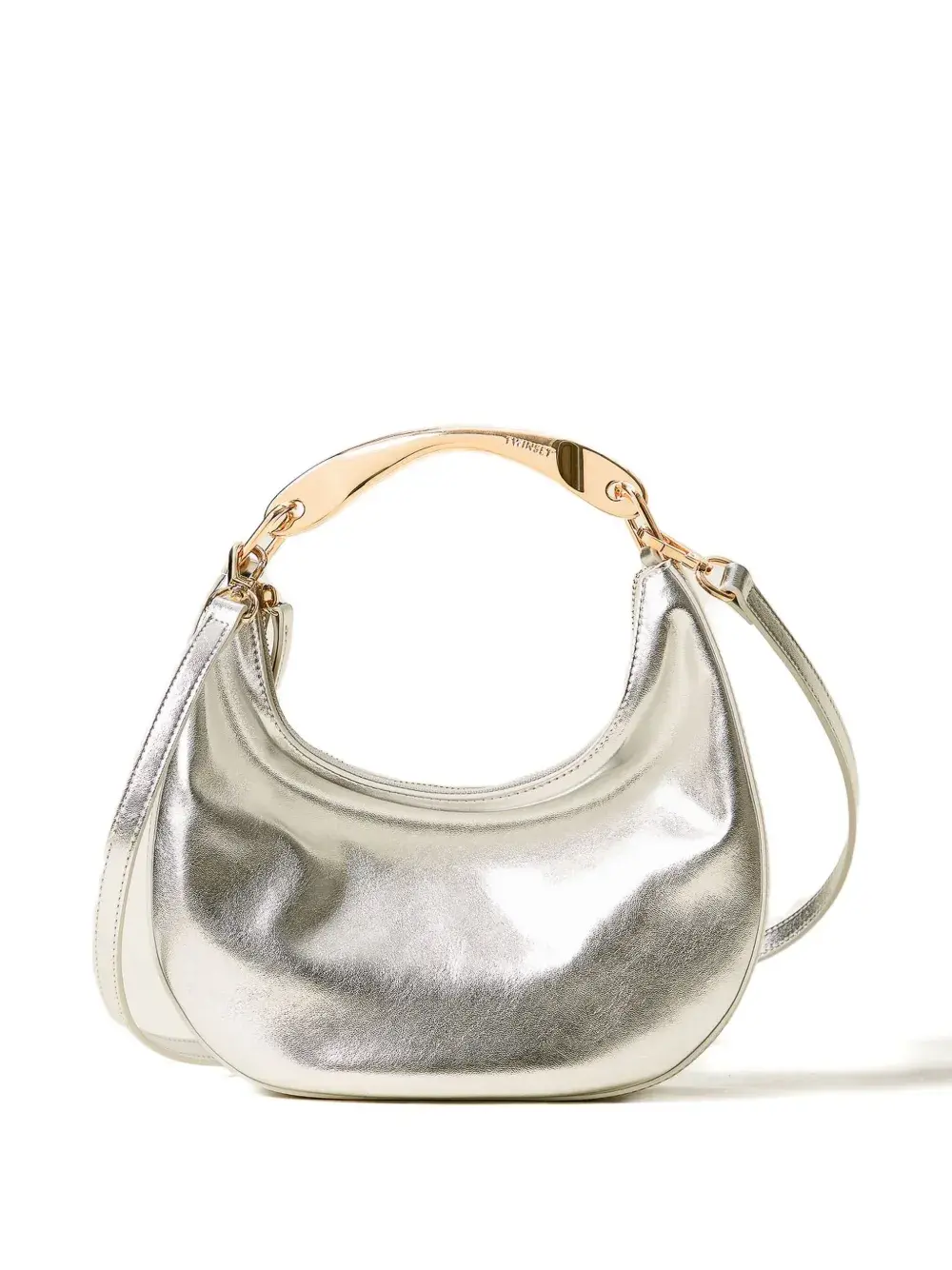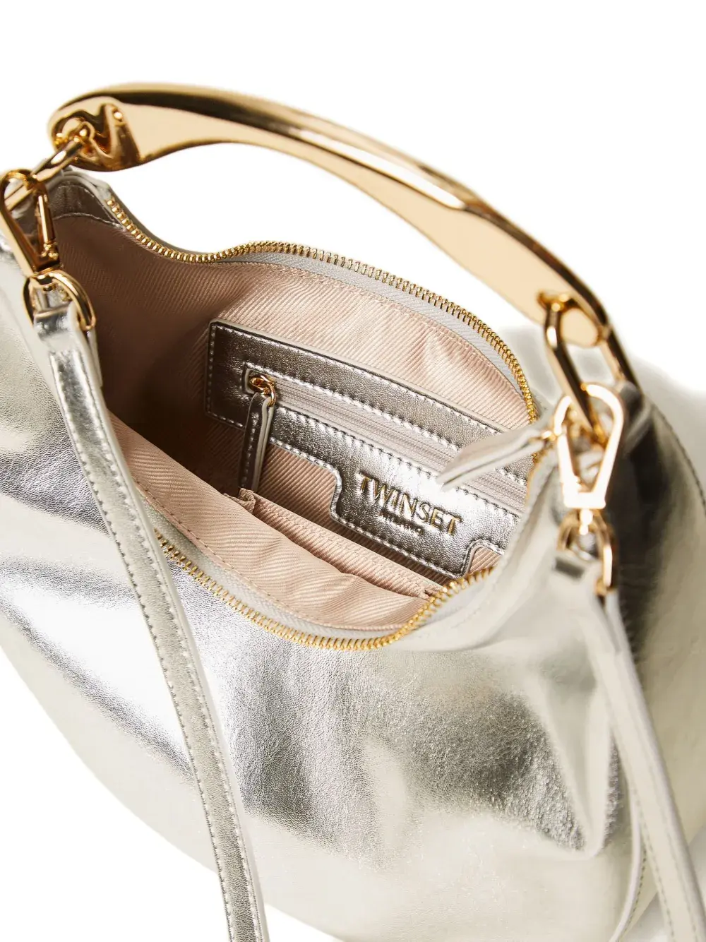 серебристая сумка с верхней ручкой, застежкой-молнией, съемным плечевым ремнем и фурнитурой золотистого оттенка