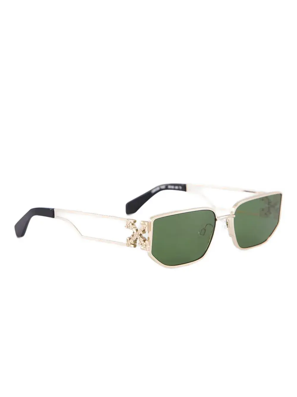 золотистого цвета, зеленые линзы, геометрическая оправа, логотип, носовые упоры, наконечники заушников черного цвета, очки поставляются в защитном футляре